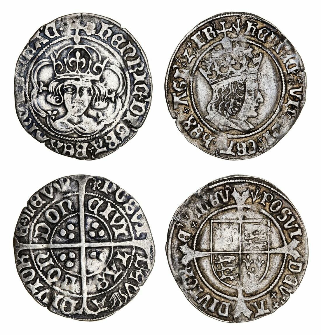Henry VII (1485-1509), Facing Bust Issue, Class IIa, Groat, Tower, crowned bust facing, fleurs on all cusps except over crown and on breast, chevron-barred a in angl, rev. long cross and pellets, 2.88g, 1h, m.m. cinquefoil (Potter and Winstanley, type 2; North 1704; Spink 2195), cleaned, softness to details, splits in flan, good fine; Profile Issue, Groat, Tower, crowned bust right, rev. square-topped shield over cross fourchée, 2.96g, 11h, m.m. pheon (North 1747; Spink 2258), some small splits and blundered to peripheries but largely complete, toned, very fine (2)