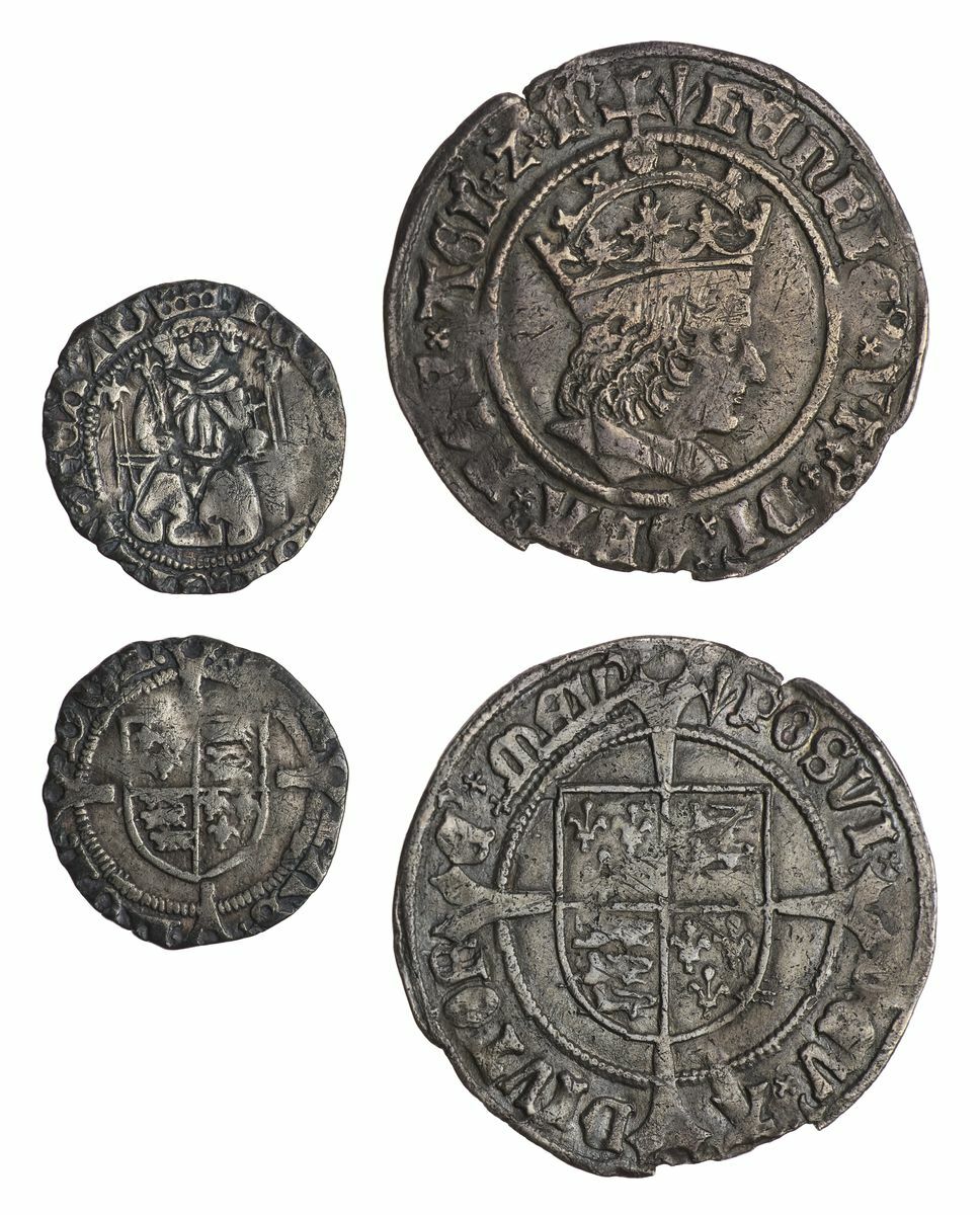 Henry VII (1485-1509), "Regular Profile" Issue, Groat, 1509-1509, Tower, crowned bust right, triple band to crown, rev. square-topped shield over long cross fourchée, 12h, 2.85g, m.m pheon (North 1747; Spink 2258), some chips to the edge and lightly scratched, yet with a uniform dark silver tone, about very fine; 'Sovereign' Penny, 1504-1505, Tower, king enthroned facing, flanked by pillars of chair, two lis-topped double pillars, rev. square-topped shield over cross fourchée, saltire stops, 7h, 0.74g, i.m cross crosslet (North 1726/1; Spink 2230), soft in parts, darker to the peripheries, very fine (2)