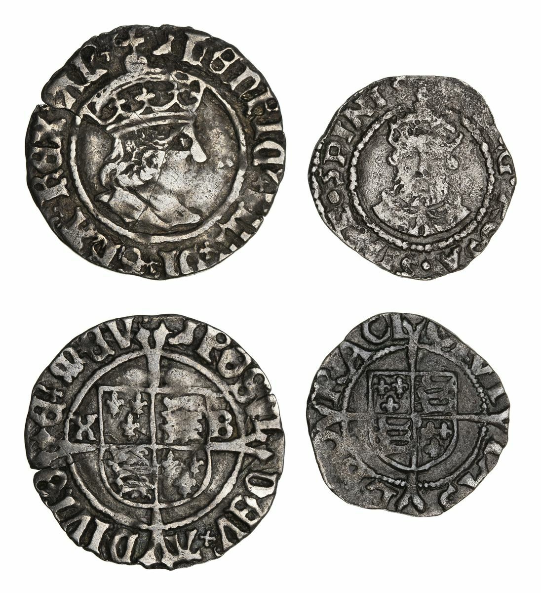 Henry VIII (1509-1547), First Coinage, Halfgroat, 1509-1526, York under Archbishop Bainbridge, crowned bust right, rev. square-topped shield over long cross fourchée, dividing X-B, saltire stops, 6h, 1.18g, m.m martlet (North 1768; Spink 2324), partial hairline crack at 10 o'clock, softly struck to the portrait, otherwise very fine; Third Coinage, 1544-47, Penny, York, crowned facing bust, rev. CIVITAS EBORACI, square-topped shield over long cross fourchée, 3h, 0.78g (North 1858; Spink 2384), lightly pitted surfaces, otherwise very fine (2)