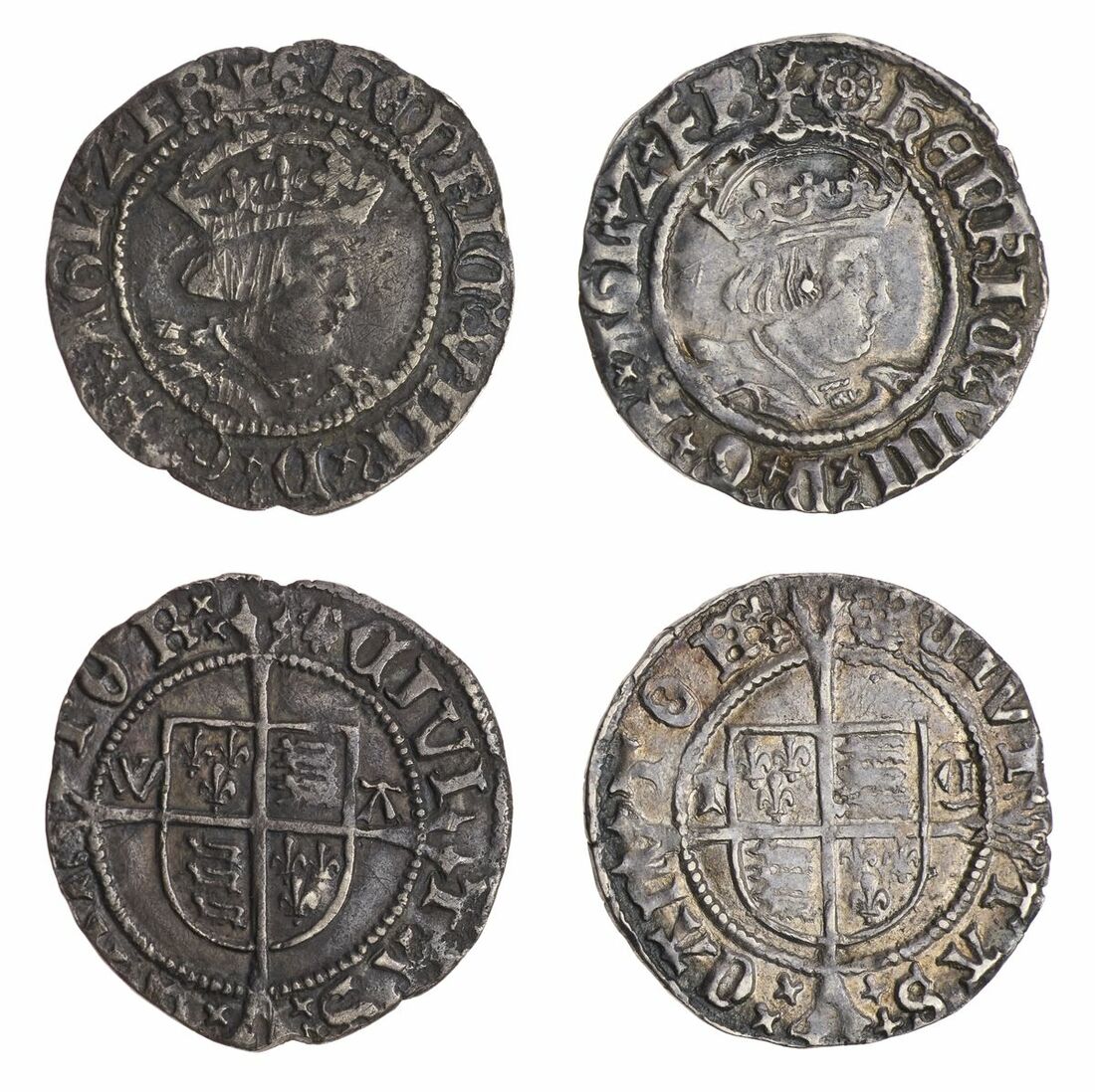 Henry VIII (1509-1547), Second Coinage, Halfgroat, 1526-1544, Canterbury under Archbishop Warham, crowned bust right, rev. CIVITAS CANTOR, square-topped shield over long cross fourchée, dividing W-A, saltire stops, 12h, 1.19g, m.m uncertain mint (North 1802; Spink 2343), light scratches across the portrait, the reverse with a pleasing cabinet tone, very fine; Halfgroat, 1526-1544, Canterbury under Archbishop Cranmer, crowned bust right, rev. CIVITAS CANTOR, square-topped shield over long cross fourchée, dividing T-C, 7h, 1.33g, m.m catherine wheel (North 1804; Spink 2345), some softness of strike to the reverse, otherwise very pleasing and toned, about extremely fine (2)