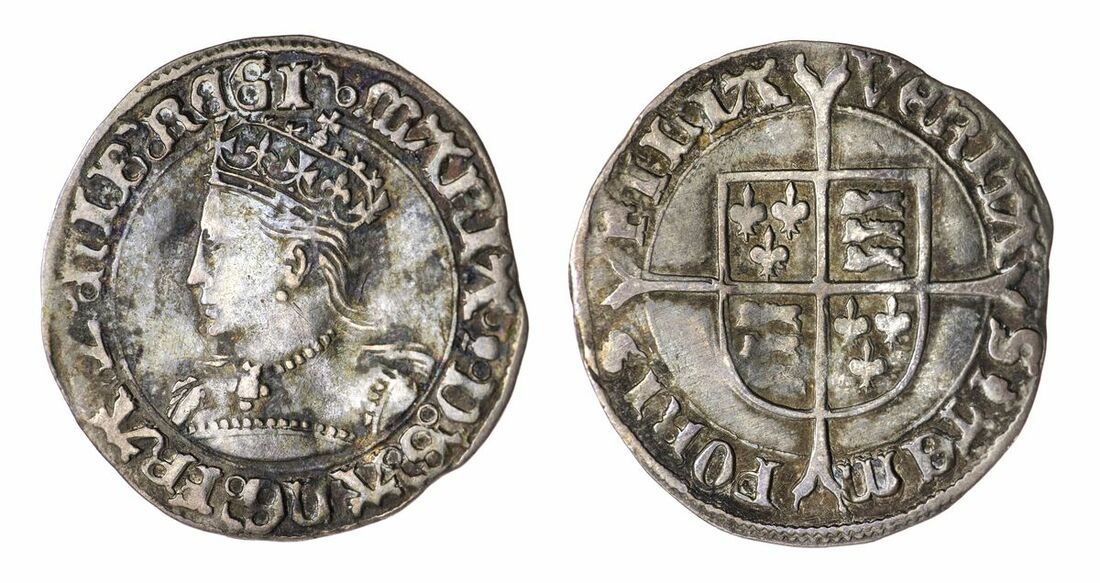 Mary Solus (1553-1554), Groat, Tower, crowned bust left, wearing simply-jewelled plain bodice and pearl necklace, rev. square-topped shield over cross fourchée, 2.07g, 6h, m.m. pomegranate (North 1960; Spink 2491), previously cleaned and with residue to parts of the legends, otherwise now with a pleasing dark silver tone, a pleasing strike, very fine