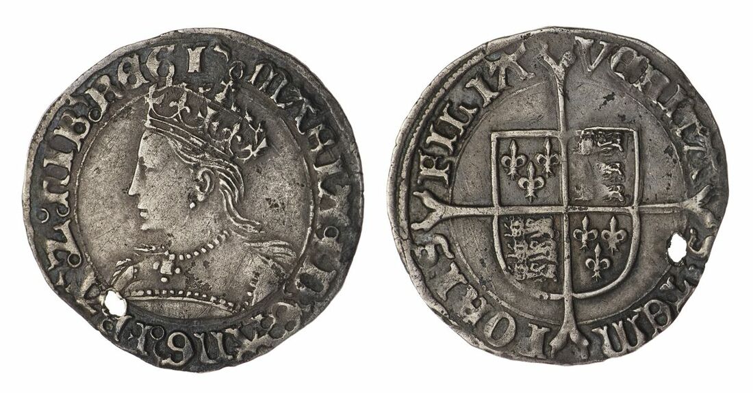 Mary Solus (1553-1554), Groat, Tower, crowned bust left, wearing simply-jewelled plain bodice and pearl necklace, rev. square-topped shield over cross fourchée, 1.94g, 1h (North 1960; Spink 2492), pierced at 7 o'clock, with minor flan splits to edge, otherwise darkly toned with areas of striking softness, nevertheless strictly fine / about very fine and even still above average for issue of this popular one-year 'Bloody Mary' type
