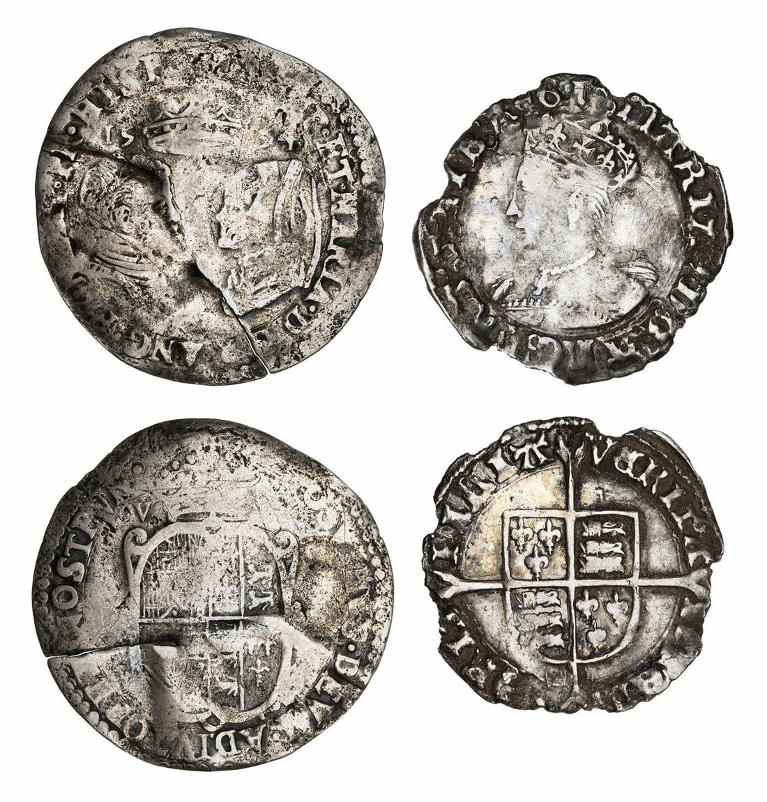 Mary Solus (1553-1554), Groat, Tower, crowned bust left, wearing simply-jewelled plain bodice and pearl necklace, rev. square-topped shield over long cross fourchée, 1.73g, 2h, m.m. pomegranate (North 1960; S.2492), chipped and ragged to edges, rubbed but toned, struck details bolder than fine; also, Philip and Mary (1554-1558), Sixpence, 1554, Tower, full titles, busts vis-a-vis, rev. crowned oval shield, 10h, 2.19g (North 1970; S.2505), creased and split, poor to fair (2)