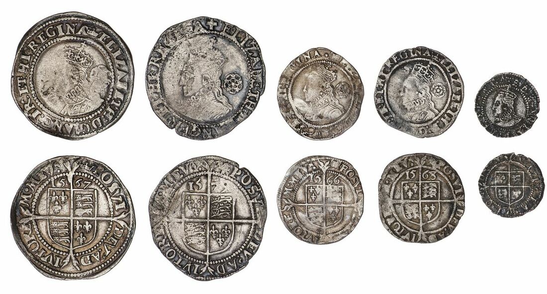 Elizabeth I (1558-1603) Third and Fourth Issues, Sixpence, 1567, Tower, crowned bust 4B left, rose behind, 2.81g, 8h, m.m coronet (North 1997; Spink 2562), lightly spade dented and mostly flat to the portrait, yet on a pleasingly round flan, fine; Fifth Issue, Sixpence, 1579, Tower, crowned bust left, rose behind, 2.87g, 4h, m.m Greek cross (North 2015; Spink 2572), scratched and lightly pitted, yet toned and better to the legends, bolder fine; Third and Fourth Issue, Threepence, 1566, Tower, bust 3F left, rose behind, 1.49g, 10h, m.m portcullis (North 1998; Spink 2565), clipped and on a waved flan, double struck in parts, yet most pleasing to the rose, light silver tone, fine, very fine in parts; Threepence, 1568, Tower, crowned portrait left, rose behind, 1.47g, 8h, m.m coronet (North 1998; Spink 2565), field find and lightly pitted, good fine; Sixth Issue, Penny, London, no rose or date, 0.35g, 8h, m.m A (North 2001; Spink 2580), field find, lightly pitted, with a pleasing dark tone, very fine (5)