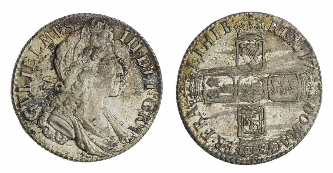 William III Solus (1694-1702), Shilling, 1700, 'Circular 00', stop after BR, fifth laureate and draped bust right, the 'high hair' variety, rev. crowned cruciform shields, five strings to harp, obliquely milled edge, 6h, 6.00g (ESC 1121A; Bull 1151; Spink 3516), light hairline across the portrait, otherwise with striated and speckled toning to handsomely lustrous surfaces, pleasing extremely fine