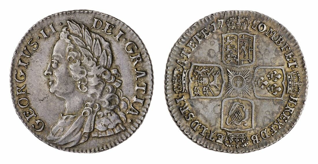 George II (1727-1760), 'Old Head' Shilling, 1750, wide 0, old laureate and cuirassed bust left, rev. crowned cruciform shields, seven strings to harp, obliquely milled edge, 6h, 6.04g (cf ESC 1211; Bull 1732; Spink 3704), some blundering to the 5 in date, wiped and some softness to the hair, nonetheless toned and with a uniform grey tone, the reverse lustrous, good very fine / near extremely fine