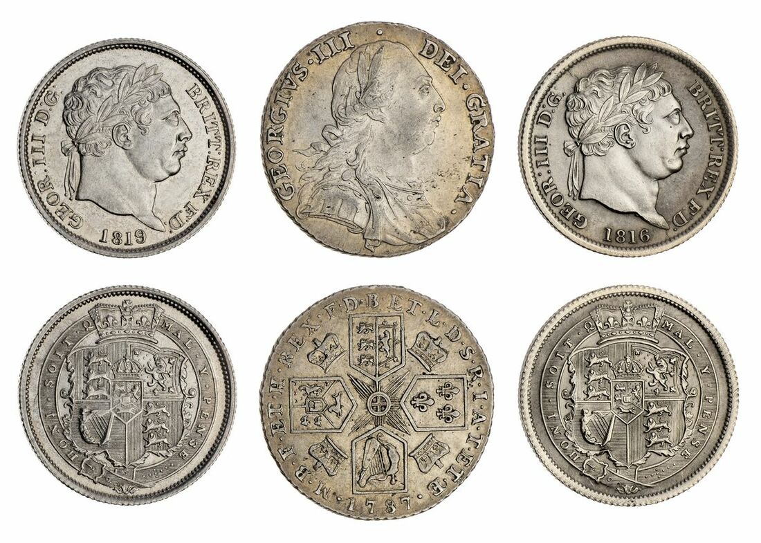 George III (1760-1820), Shilling, 1787, with hearts, laureate and armoured bust right, rev. cruciform shields, seven strings to harp, obliquely milled edge, 12h, 5.99g (ESC 1225; Bull 2129; Spink 3746), wiped and some flecking across the bust, otherwise lustrous, very fine; 'New Coinage' Shilling, 1816, laureate head right, rev. crowned shield within Garter, milled edge, 5.64g, 12h (ESC 1228; Bull 2140; Spink 379), wiped yet lustrous, very fine; another, 1819, as before, milled edge, 12h, 5.63g (ESC 1235; Bull 2152; Spink 3790), some light cabinet friction, otherwise lustrous, extremely fine (3)