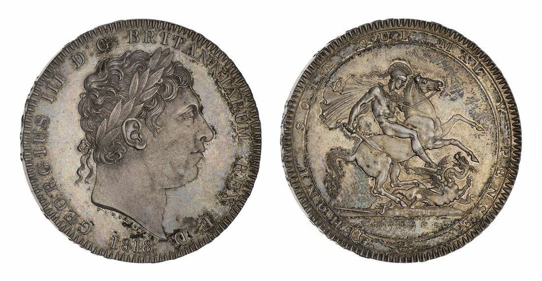 George III (1760-1820), 'New Coinage' Crown, 1818 LVIII, laureate bust right, rev. St George and Dragon within Garter, upwards lettered edge, 6h, 28.17g (ESC 211; Bull 2005; Spink 3787), with a brilliance beneath grey toned surfaces, speckled in darker toned in parts, with a handsome flare and much as struck