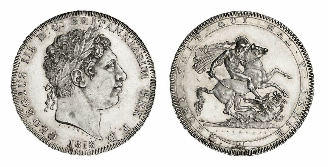 George III (1760-1820), 'New Coinage' Crown, 1818 LVIII, laureate head right, rev. St George and Dragon within Garter, upwards lettered edge, 6h, 28.27g (ESC 211; Bull 2005; Spink 3787), hairlining to the fields and some pinmarking, more so to the reverse, nonetheless with much brilliance to the fields and a light ochre tone, extremely fine
