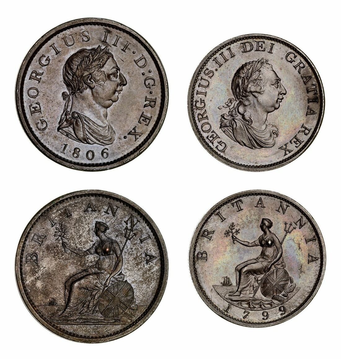 George III (1760-1820), Penny, 1806, Soho, laureate and draped bust right, with incuse hair curl, K on truncation, rev. Britannia seated left, centre milled edge, 6h, 18.71g (BMC [Peck] 1342; Spink 3780), with a pleasing blue tone and lustrous to dark chocolate brown surfaces, extremely fine; Halfpenny, 1799, Soho, laureate and draped bust right, rev. Britannia seated left, centre milled edge, 6h, 12.52g (BMC [Peck] 1248; Spink 3778), metal flaw to the reverse field, cabinet toned to dark glossy surfaces, extremely fine (2)