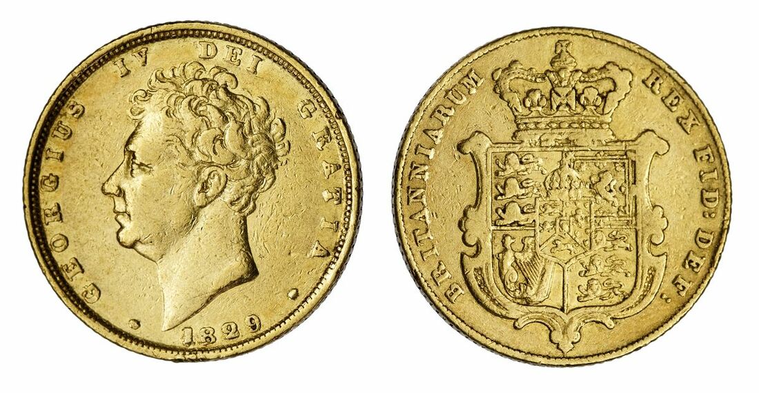 (g) George IV (1820-1830), 'Chantrey's' Sovereign, 1829, bare head left, rev. crowned garnished shield, edge milled, 7.86g, 6h (Bentley 22; Marsh 14; MCE 480; Spink 3801), cleaned and heavily pinmarked, softness to the higher points of the shield and hair, nonetheless with a remaining and pleasing lustre within the legends, about very fine