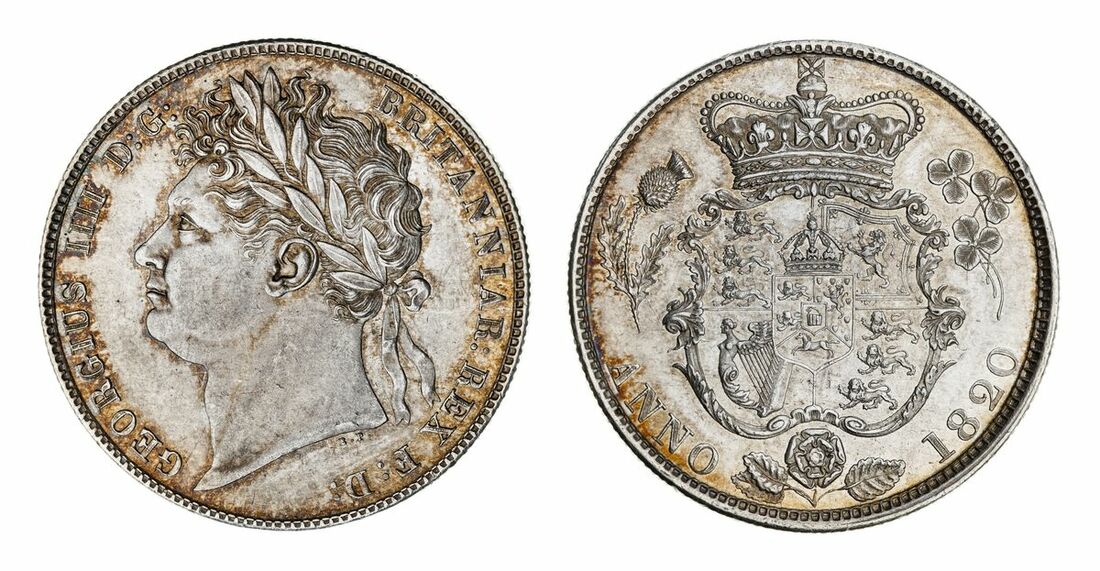 George IV (1820-1830), Halfcrown, 1820, Type 1, laureate bust right, rev. lightly garnished shield, milled edge, 6h, 14.10g (ESC 628; Bull 2357; Spink 3807), once wiped and with a scattering of minor contact marking, nonetheless with a pleasing lustre and near brilliant to the reverse, speckled ochre toning, bolder extremely fine