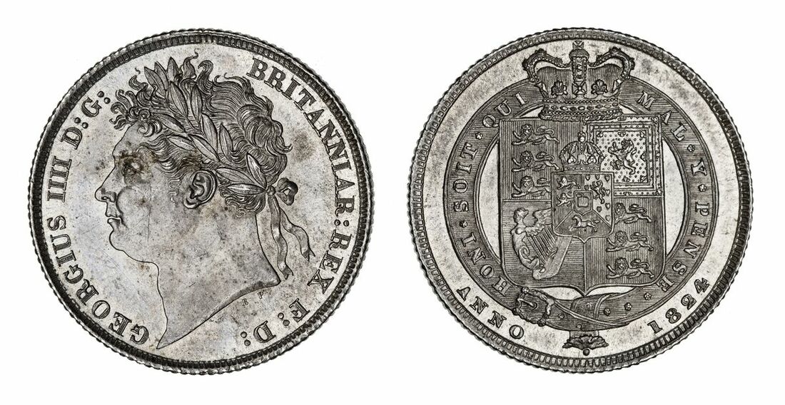 George IV (1820-1830), 'Garter' Shilling, 1824, Type 2, laureate head left, rev. crowned shield within Garter, milled edge, 5.68g, 6h (ESC 1251; Bull 2400; Spink 3811), hairline across the cheek, nonetheless with a pleasing lustrous-bloom and hints of electric blue toning, nearing as struck
