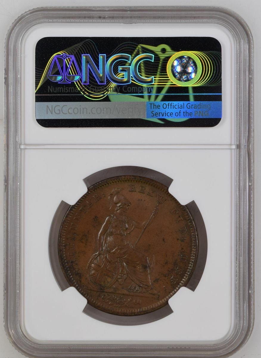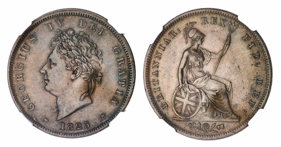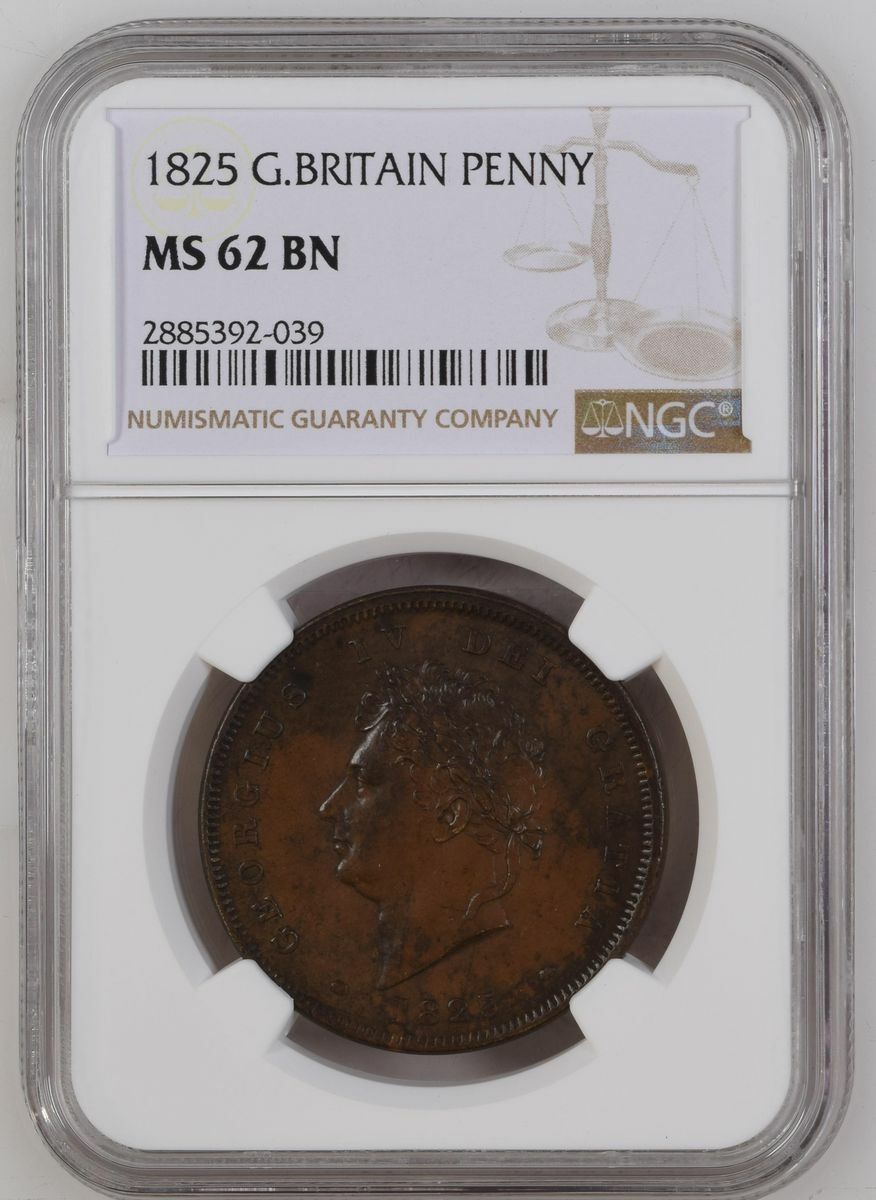 (x) MS62 BN | George IV (1820-1830), Penny, 1825, laureate head left, rev. Britannia seated right, plain saltire, emblems in exergue, plain edge, 1h (BMC [Peck] 1420; Spink 3823), some very light bagmarks, areas of darker brown toning to otherwise light brown fields, extremely fine, in NGC holder, graded MS62 BN (Cert. #2885392-039)
