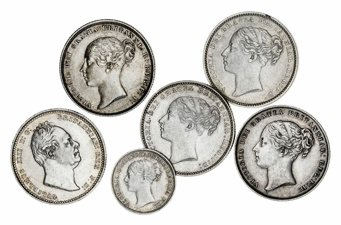 Shillings (6) | William IV (1830-1837), Shilling, 1837, bare head right, rev. crowned value in wreath, milled edge, 6h, 5.65g (ESC 1276; Bull 2497; Spink 3835), cleaned, yet now retoning, very fine; Victoria (1837-1901), 'Young Head' Shilling, 1838, Type A¹, first young head left, W.W. on truncation, rev. crowned value in wreath, edge milled, 6h, 5.67g (Bull 2973; ESC 1278; Spink 3902), rub to the hair, otherwise with a rich cabinet tone and glossy lustre, a good very fine first year of issue type; 'Young Head' Shilling, 1857, Type A³, milled edge, 6h, 5.64g (ESC 1305; Bull 3008; Spink 3904), wiped and hairlined, otherwise with a pleasing dark silver tone, good very fine; 'Young Head' Shilling, 1880, Type A7, short dumpy line, milled edge, 6h, 5.65g (ESC -; Bull 3063; Spink 3063), with a pleasing mint lustre, uncirculated; 'Young Head' Shilling, 1883, Type A7, milled edge, 6h, 5.63g (ESC 1342; Bull 3072; Spink 3907), wiped and lightly hairlined, small edge bruise at 1 o'clock, very fine; 'Young Head' Threepence, 1879, plain edge, 6h, 1.41g (ESC 2085; Bull 3423; Spink 3914C), wiped, otherwise toned, bolder very fine (6)