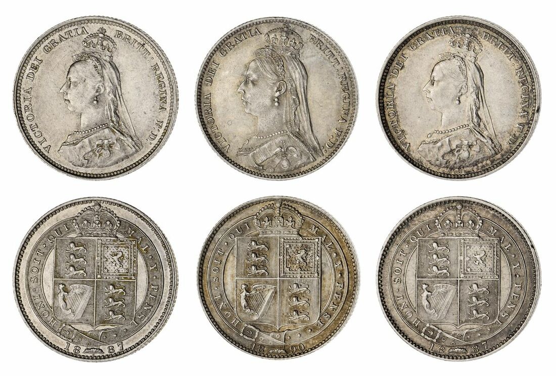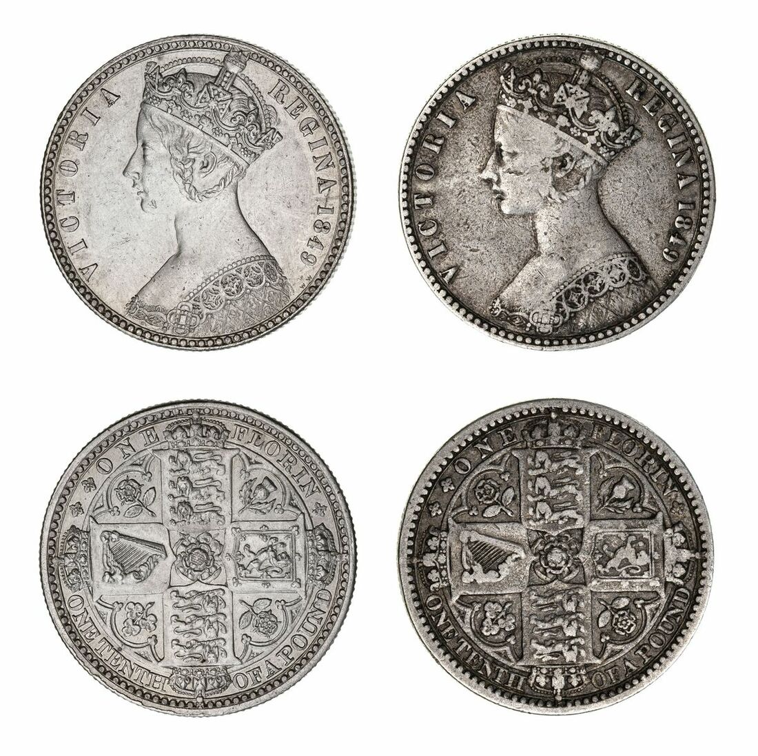 Victoria (1837-1901), 'Godless' Florin, 1849, crowned 'Gothic' bust left, W.W. after date, rev. crowned shields cruciform, emblems in angles, edge milled, 11.16g, 6h (ESC 802; Bull 2815; Spink 3890), rubbed, fine; another, 1849, as before, milled edge, 11.30g (ESC 802; Bull 2815; Spink 3890), cleaned, otherwise with a hint of lustre, very fine; 'Golden Jubilee' Shilling, 1887, small crowned Jubilee bust left, rev. crowned shield in Garter, milled edge, 12h, 5.66g (ESC 1351; Bull 3137; Spink 3926), lightly wiped and hairlined, nonetheless lustrous, bolder very fine; another, 1887, as before, milled edge, 12h, 5.63g (ESC 1351; Bull 3137; Spink 3926), friction marked to the obverse and deposits to the fields, otherwise the reverse field with a pleasing flashy lustre, bolder very fine, the reverse better; Shilling, 1890, large crowned Jubilee bust left, rev. crowned shield in Garter, milled edge, 12h, 5.64g (ESC 1357; Bull 3144; Spink 3927), some faint hairlines, otherwise with a pleasing honey-orange tone to lustrous fields, extremely fine (5)