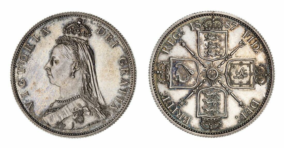 Victoria (1837-1901), 'Golden Jubilee' Proof Florin, 1887, crowned Jubilee bust left, rev. crowned cruciform shields, sceptres in angles, milled edge, 12h, 11.28g (ESC 869; Bull 2954; Spink 3925), light hairlining and friction marking, with a light purple tone to the obverse, nonetheless brilliant, the reverse better, good extremely fine