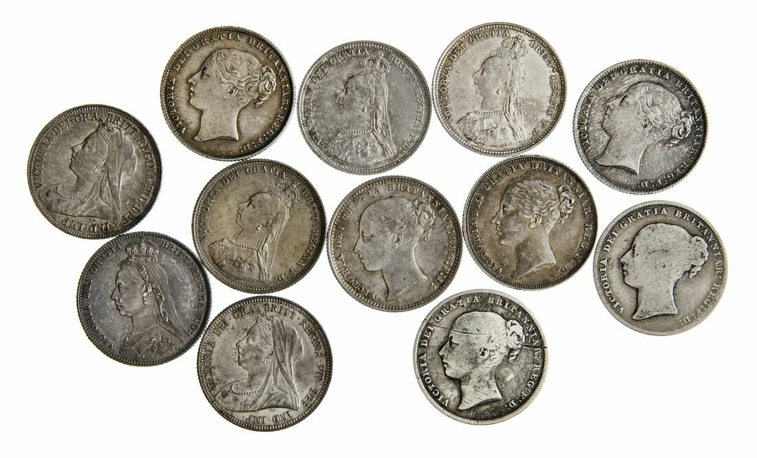 Shillings (12) | Victoria (1837-1901), 'Young Head' Shilling, 1838, Type A1, milled edge, 6h, 5.65g (1278; Bull 2973; Spink 3902), wiped, very fine; 1841, Type A3, milled edge, 6h, 5.20g (ESC 1287; Bull 2986; Spink 3904), cleaned, scratched, fair; 1848 over 6, Type A3, milled edge, 6h, 5.23g (ESC 1294; Bull 2994; Spink 3904), cleaned and flat, fair; 1864 [die 10], Type A4, milled edge, 6h, 5.67g (ESC 1312; Bull 3024; Spink 3905), lustrous, extremely fine; 1867 [die 28], Type A4, milled edge, 6h, 5.66g (ESC 1315; Bull 3030; Spink 3905), handsome lustre and toned, extremely fine; 1872 [die 97], Type A6, milled edge, 6h, 5.66g (ESC 1324; BULL 3042; Spink 3906A), die flaw across truncation and pitted mark to neck, otherwise lustrous and toned, extremely fine; 'Golden Jubilee' Shilling, 1887, wide date, milled edge, 12h, 5.64g (ESC 1351; Bull 3137; Spink 3926), light friction marking, to otherwise bright and lustrous surfaces, speckled toning, extremely fine; 1887, wide date, milled edge, 5.63g (ESC 1351; Bull 3137; Spink 3926), with a full and handsome lustre, toned, much as struck; 1888 over 7, wide date, milled edge, 12h, 5.63g (ESC -; Bull 3140; Spink 3926), lightly friction marked to obverse, lustrous and with toning to the peripheries, extremely fine; Proof 1889, narrow date, milled edge, 12h, 5.63g (ESC 1356; Bull 3134; Spink 3927), faint pinmarking, otherwise brilliant beneath rich cabinet toning, extremely fine; 'Old Head' Shilling, 1893, small lettering, milled edge, 12h, 5.65g (ESC 1361A; Bull 3154; Spink 3940), wiped, the reverse darkly toned, extremely fine; 1898, milled edge, 12h, 5.66g (ESC 1367; Bull 3163; Spink 3940A), wiped, yet toned, bolder very fine (12)