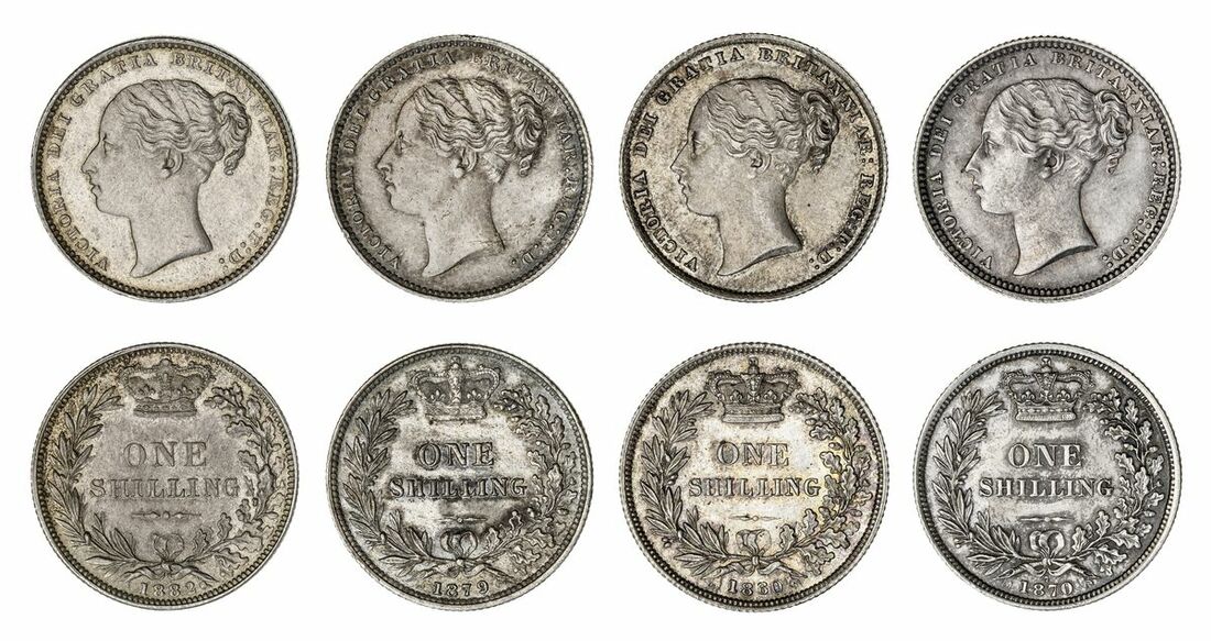 Victoria (1837-1901), 'Young Head' Shilling, 1860, small 6, Type A³, second young head left, plain on truncation, rev. crowned value in wreath, milled edge, 6h, 5.62g (ESC 1308; Bull 3018; Spink 3904), lustrous and toned, extremely fine; Shilling, 1870 [Die 7], Type A6, third young head left, plain on truncation, rev. crowned value in wreath, die number below ties, edge milled, 6h, 5.63g (Bull 3038; ESC 1320; Spink 3906A), touch of softness to the hair, otherwise toned, about extremely fine; Shilling, 1879, Type A7, fourth young head left, plain on truncation, rev. crowned value in wreath, milled edge, 6h, 5.63g (ESC 1334; Bull 3061; Spink 3907), pinmarked across the neck and a small edge bruise, otherwise good very fine; Shilling, 1882, Type A7, fourth young head left, plain on truncation, rev. crowned value in wreath, milled edge, 6h, 5.65g (ESC 1341; Bull 3071; Spink 3907), residual lustre, about extremely fine (4)