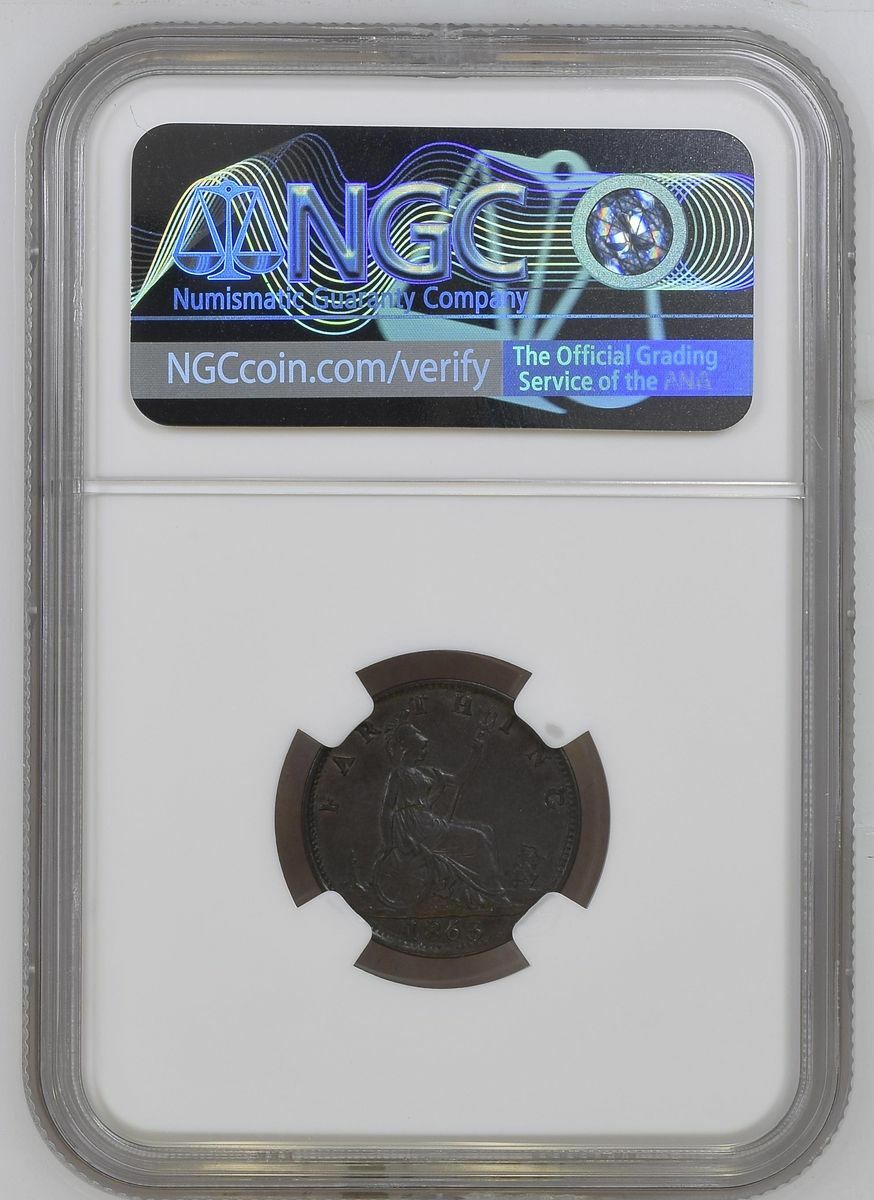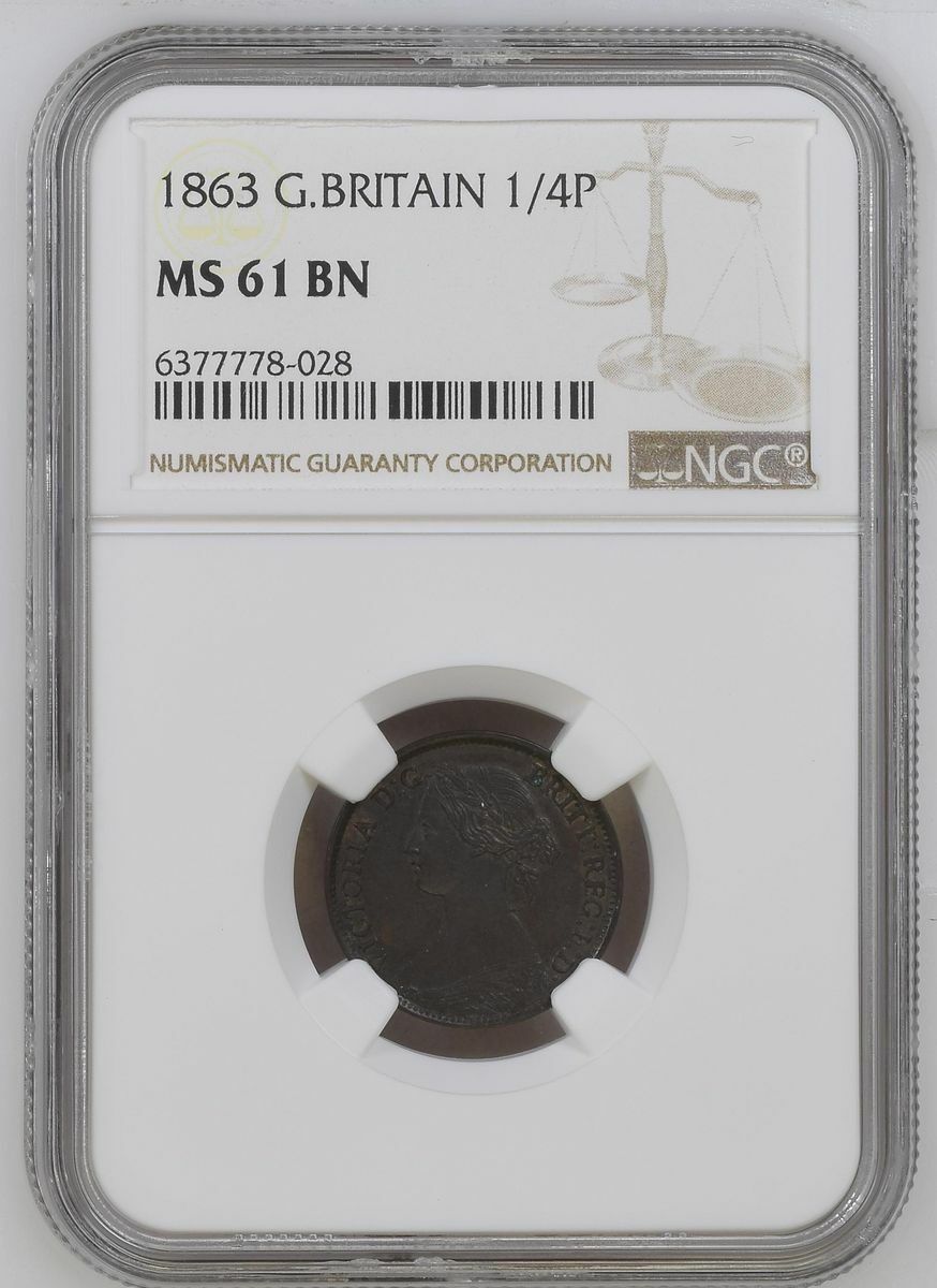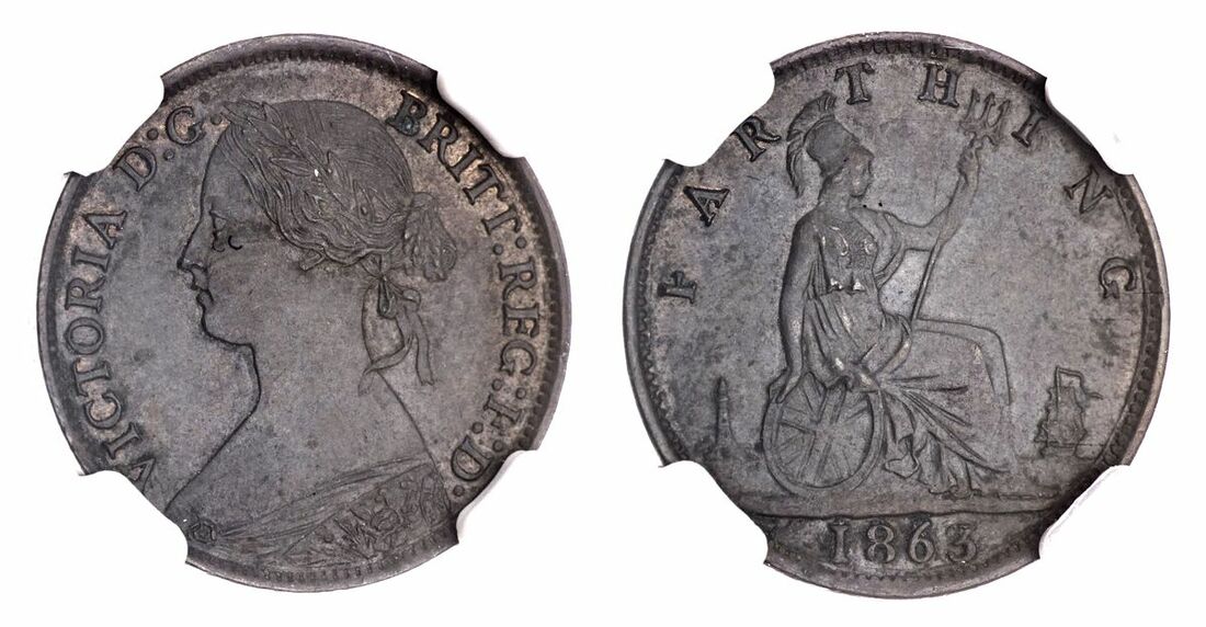 (x) MS61 BN | Victoria, Farthing, 1863, laureate head left, rev. Britannia seated right, plain edge, 12h (BMC [Peck] 1867; Spink 3958), lighter brown within the legends to otherwise dark surfaces, extremely fine, in NGC holder, graded MS61 BN (Cert. #6377778-028)