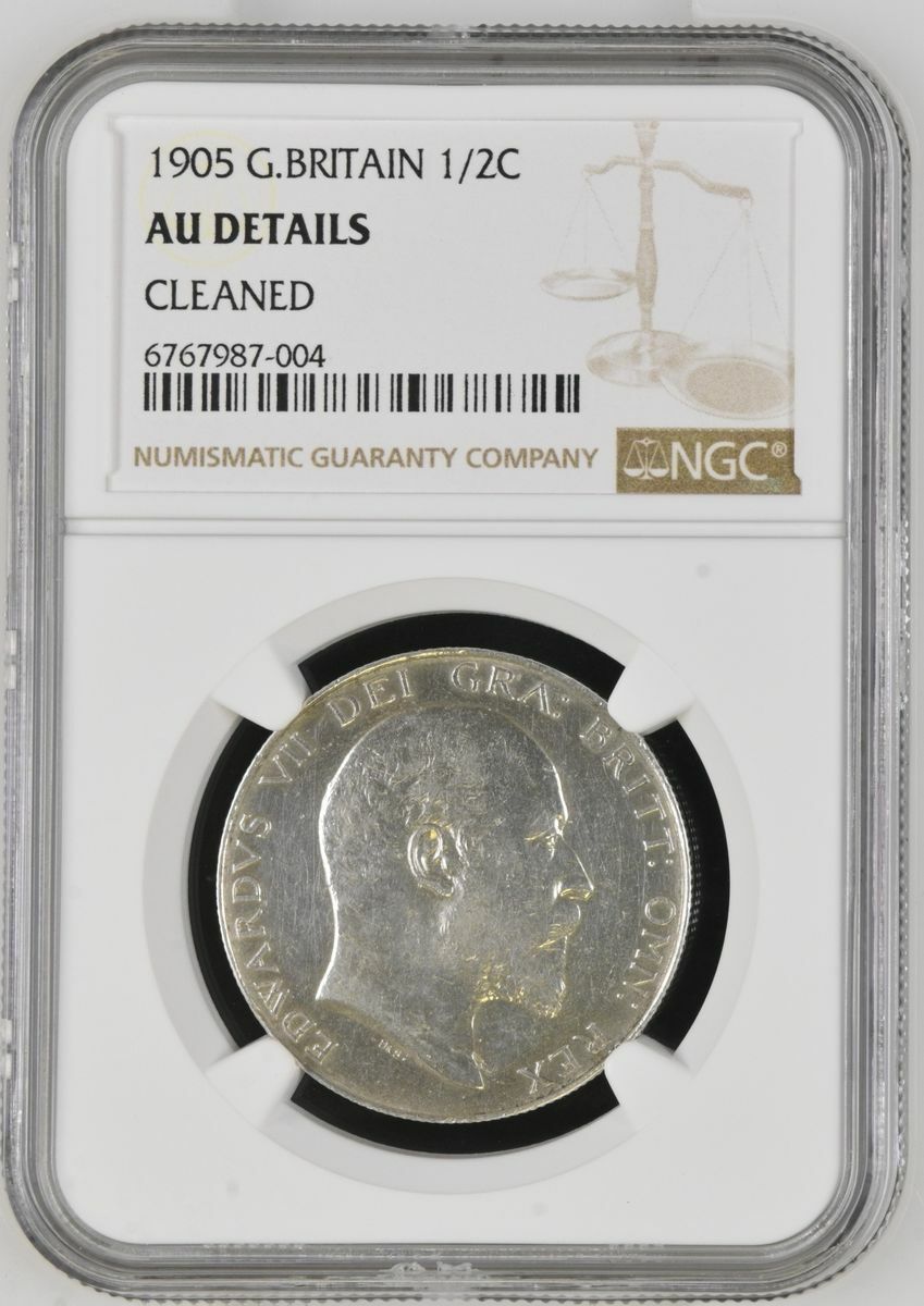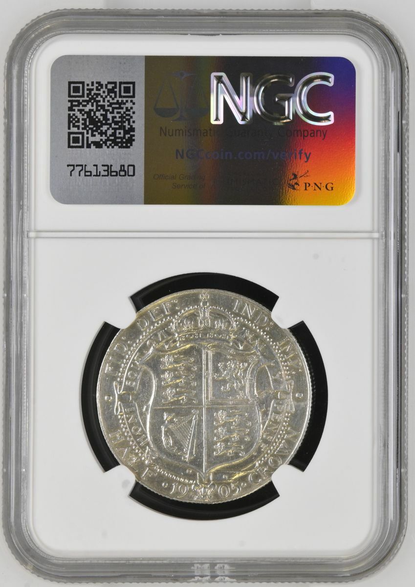 Edward VII (1901-1910), Halfcrown, 1905, bare head right, rev. crowned shield in Garter, edge milled, 14.11g, 12h (ESC 750 [R2]; Bull 3571; S.3980), cleaned with a small rim bruise, devices and portrait pleasingly uniform and atypically bold for strike, strictly very fine, the reverse better, and the celebrated KEY DATE of series, in NGC holder, graded AU DETAILS ~ Cleaned (Cert. #6767987-004)
