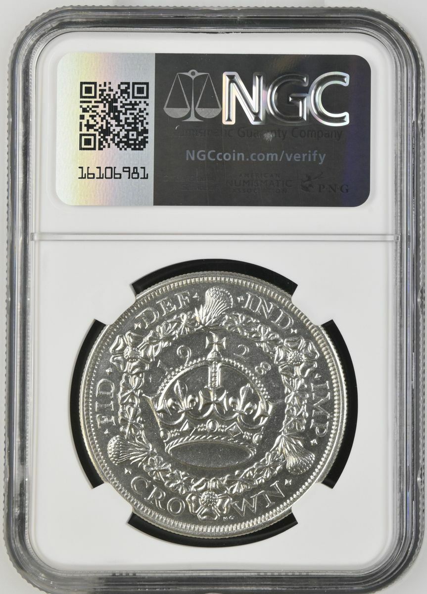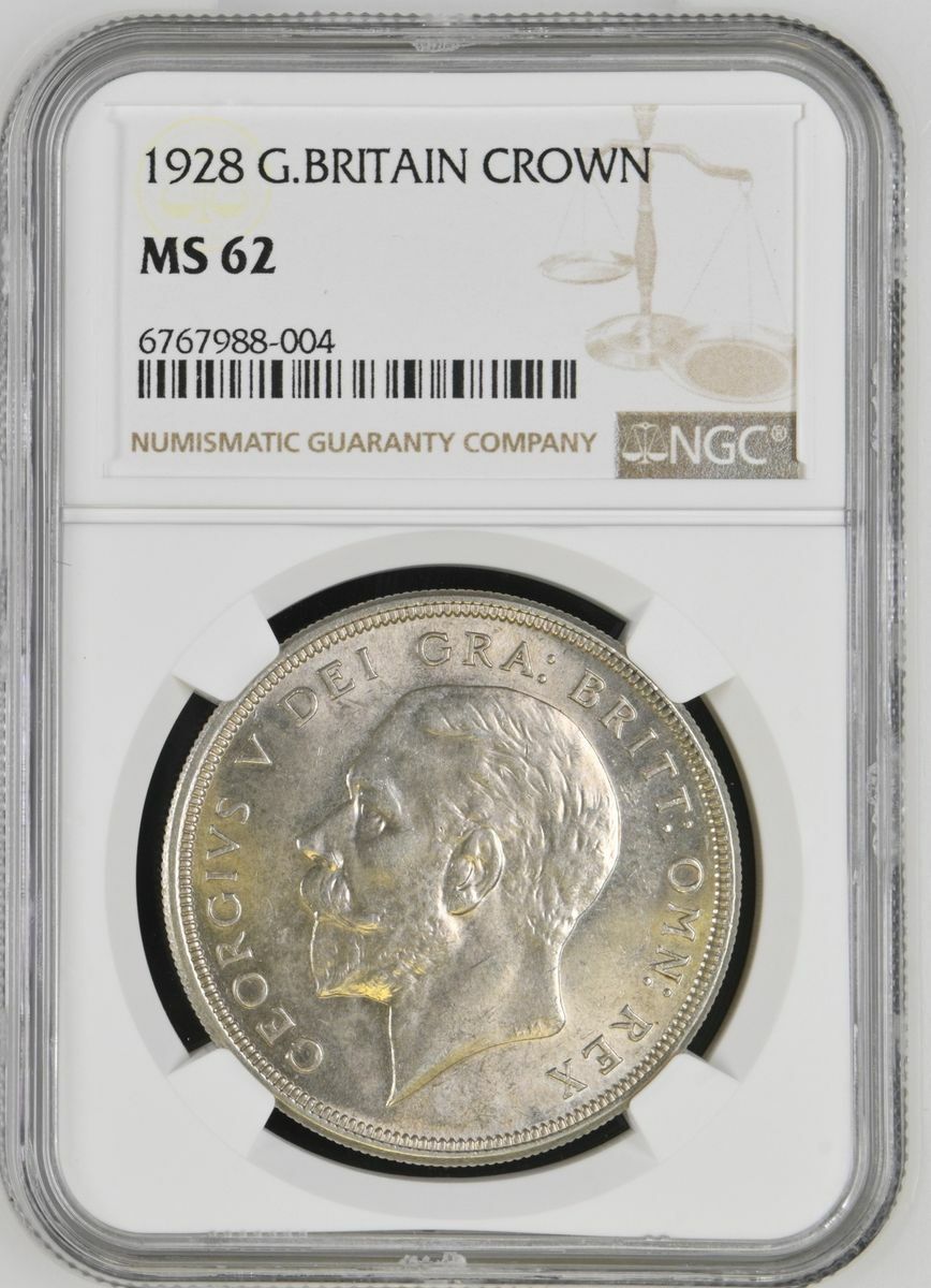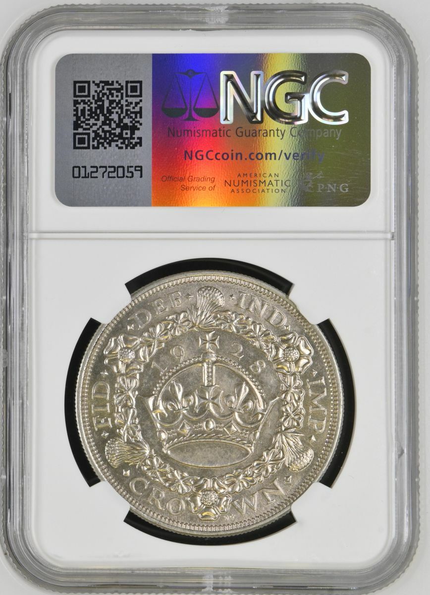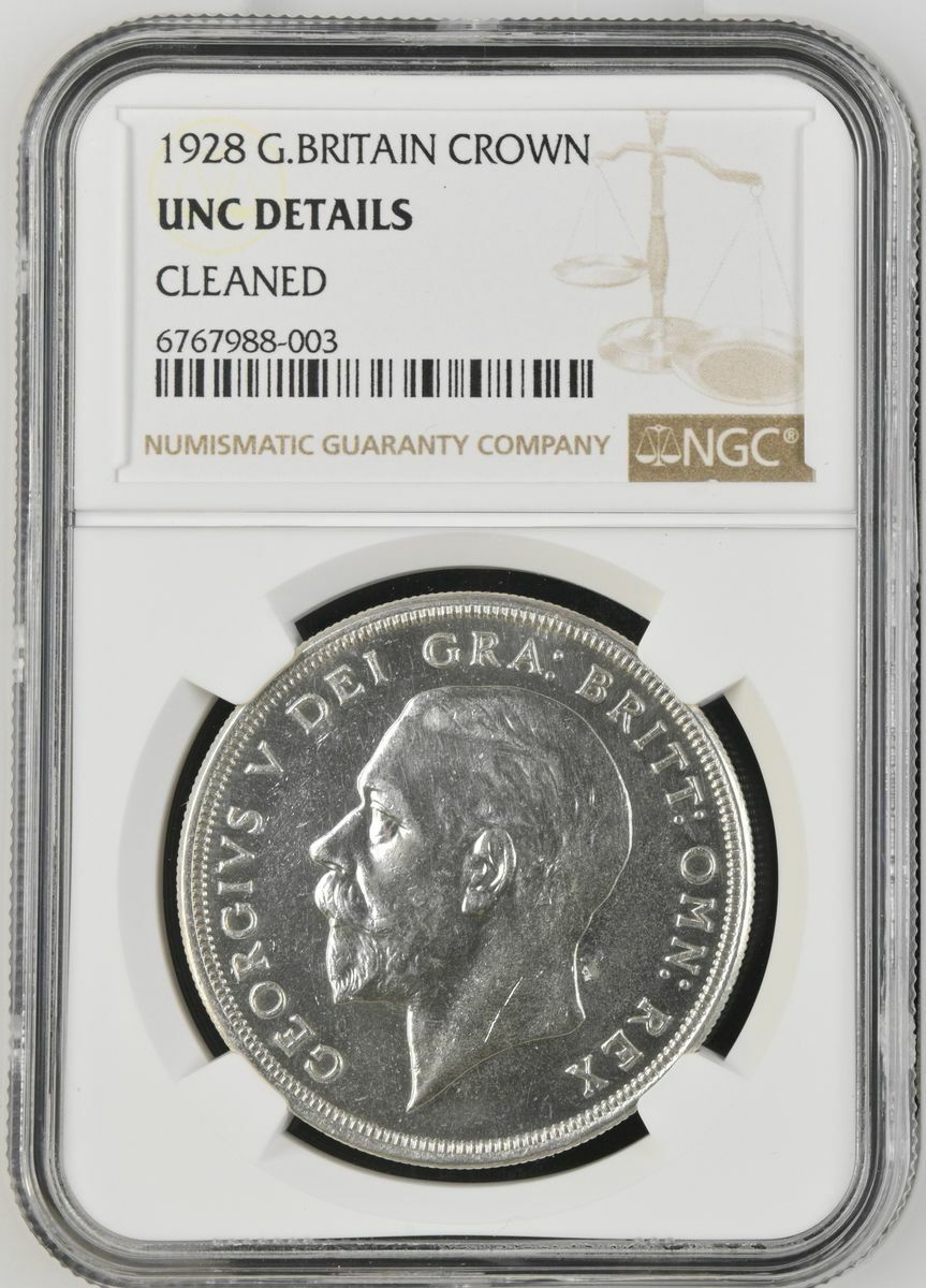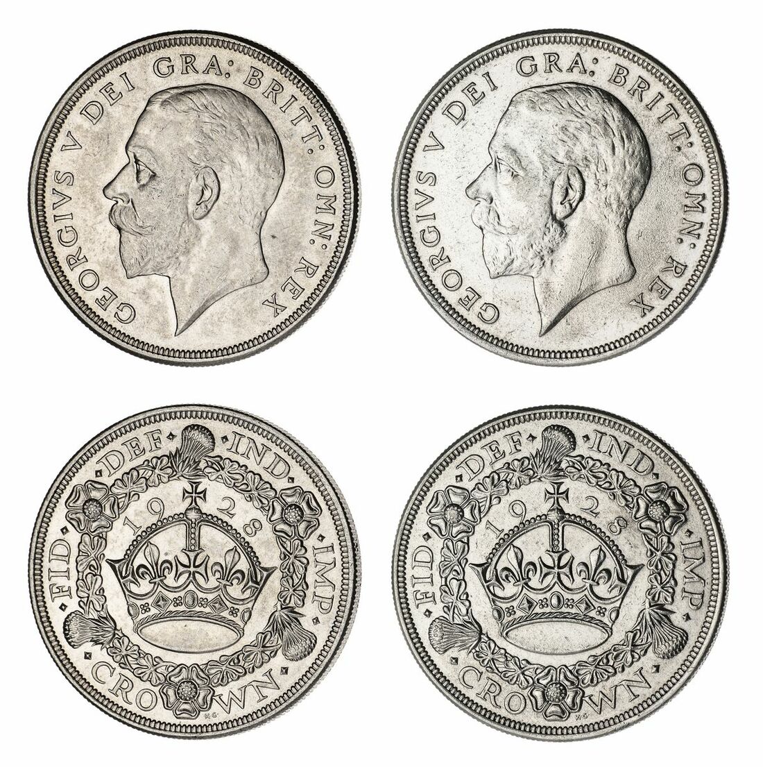 NGC MS62 | George V (1910-1936), 'Wreath' Crown, 1928, bare head left, rev. crown within wreath, edge milled, 28.20g, 12h, light bagmarking and a touch of softness to the hair, otherwise with a pleasing cartwheel lustre, extremely fine, one of only 9,034 struck, in NGC holder, graded MS62 (Cert. #6767988-004); another, 1928, as before, 28.25g, 12h (ESC 368; Bull 3633; S.4036), cleaned and with a resulting porosity to the obverse field, otherwise a very bold very fine, one of only 9,034 struck , in NGC holder, graded UNC Details ~ Cleaned (Cert. #6767988-003) (2)