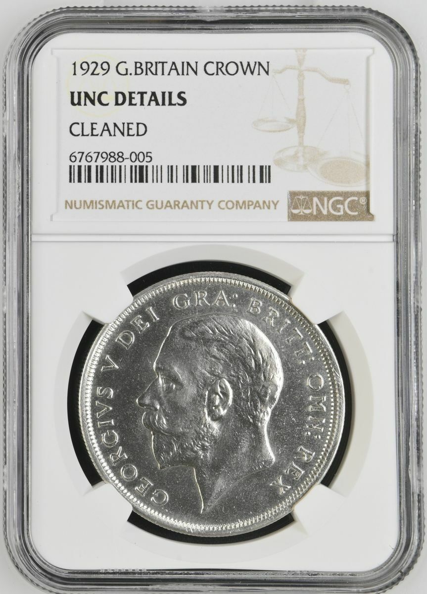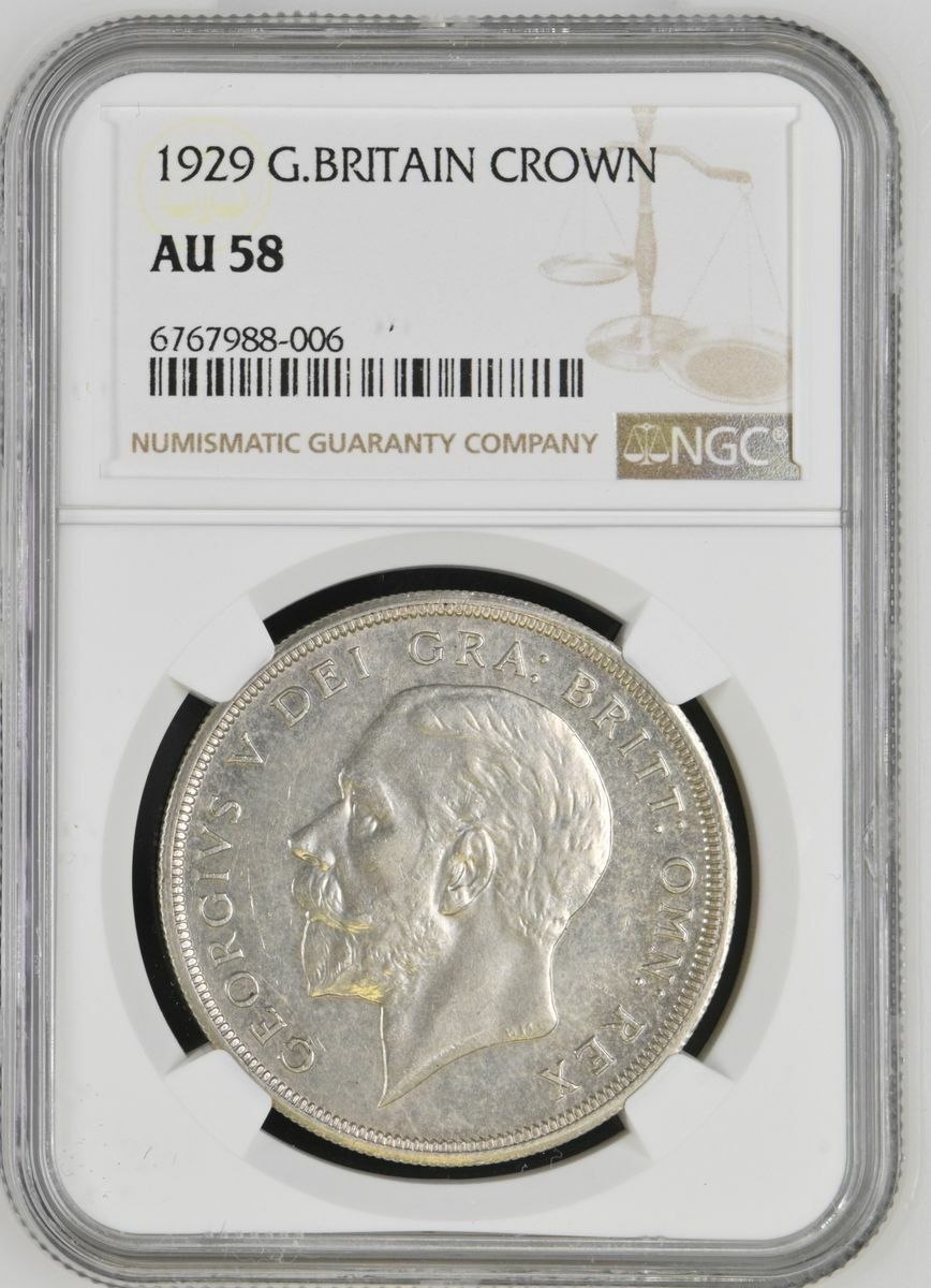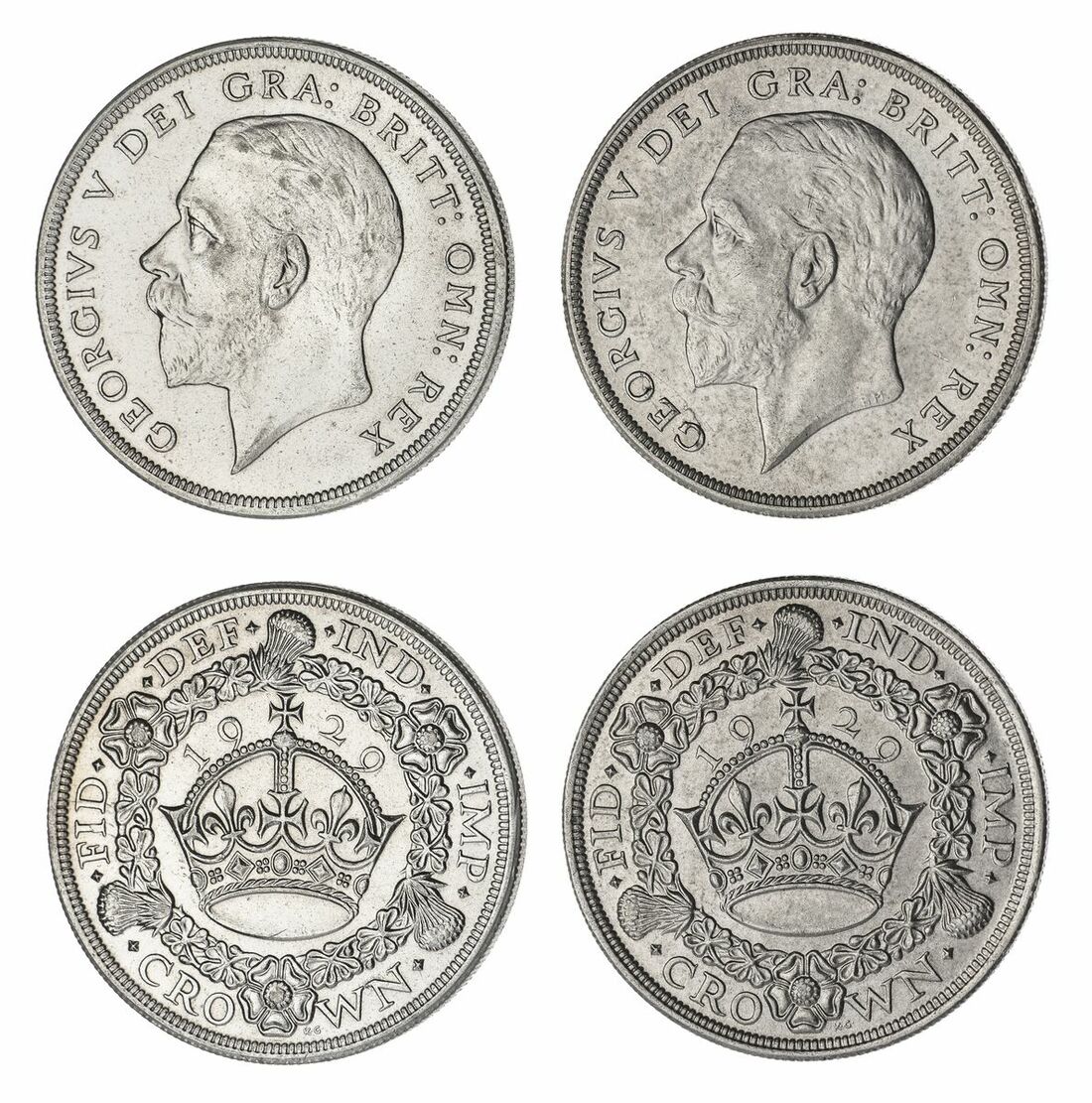 NGC AU58 | George V (1910-1936), 'Wreath' Crown, 1929, bare head left, rev. crown within wreath, milled edge, 28.28g, 12h, scattering of bagmarks, yet with a pleasing lustre to the fields, about extremely fine, one of only 4,994 struck, in NGC holder, graded AU58 (Cert. #6767988-006); another, 1929, as before, milled edge, 28.29g, 12h (ESC 369; Bull 3636; S.4036), cleaned and a scattering of light contact marks, otherwise extremely fine for strike, one of only 4,994 struck, in NGC holder, graded UNC Details ~ Cleaned (Cert. #6767988-005) (2)