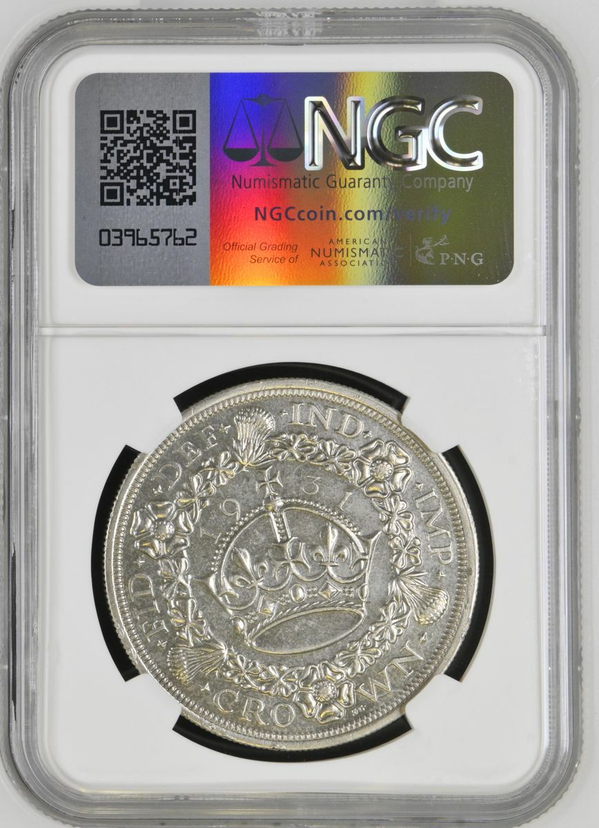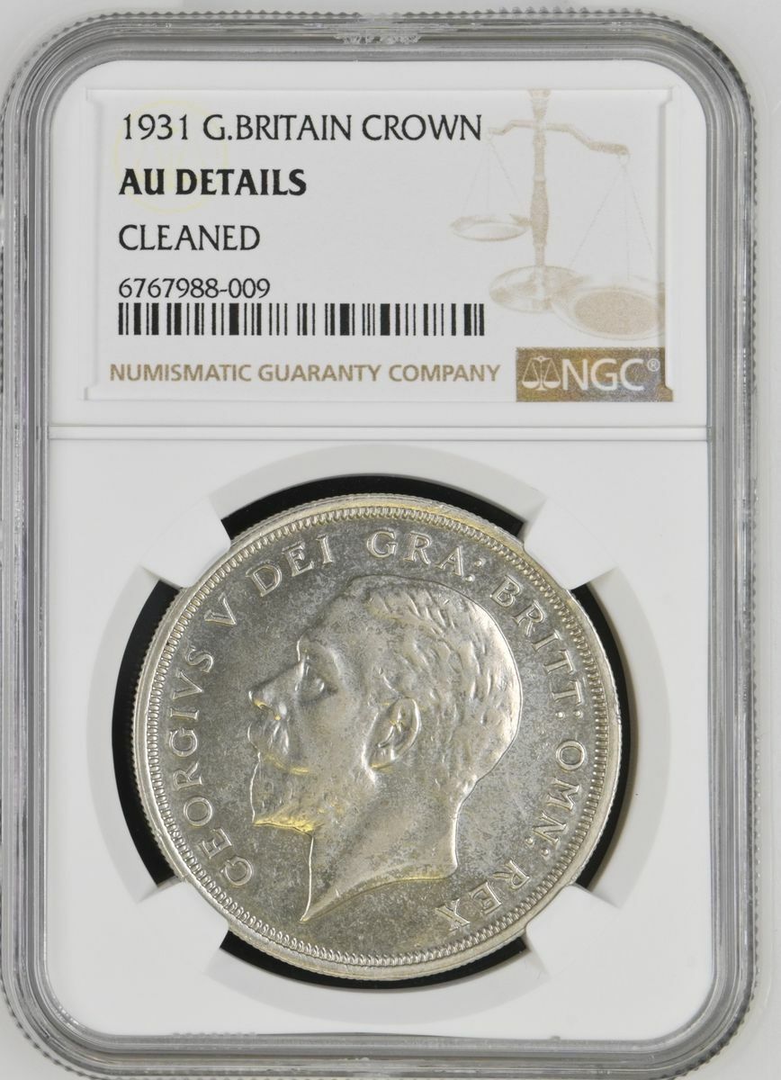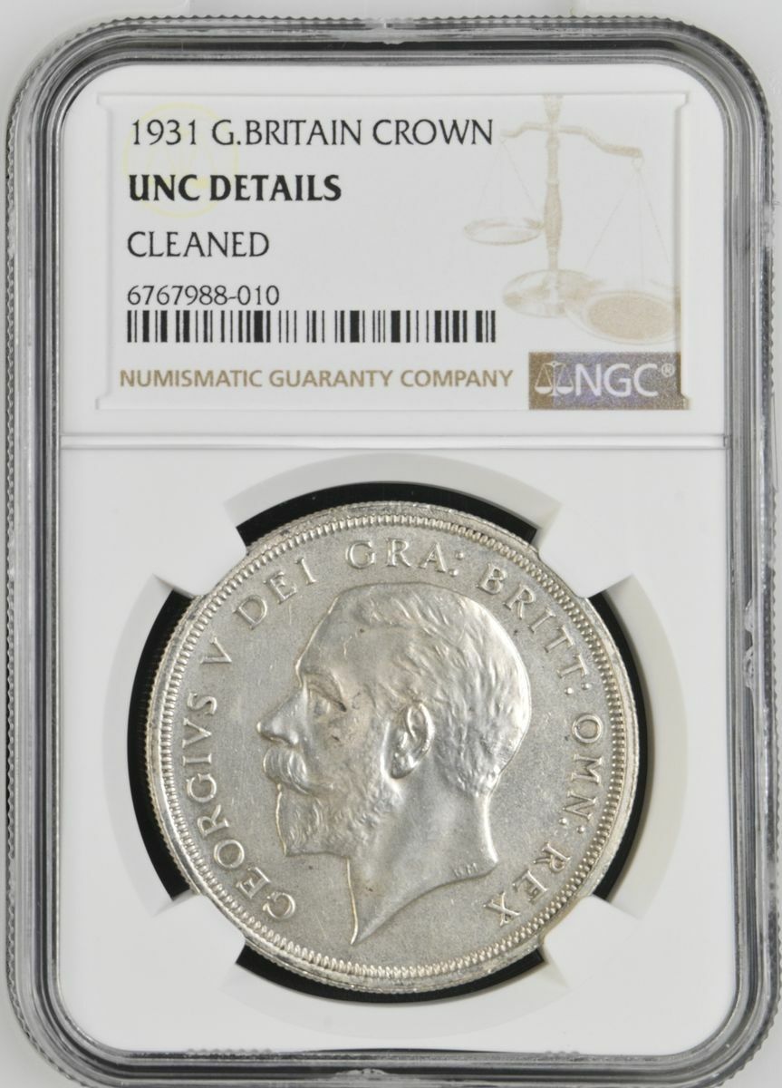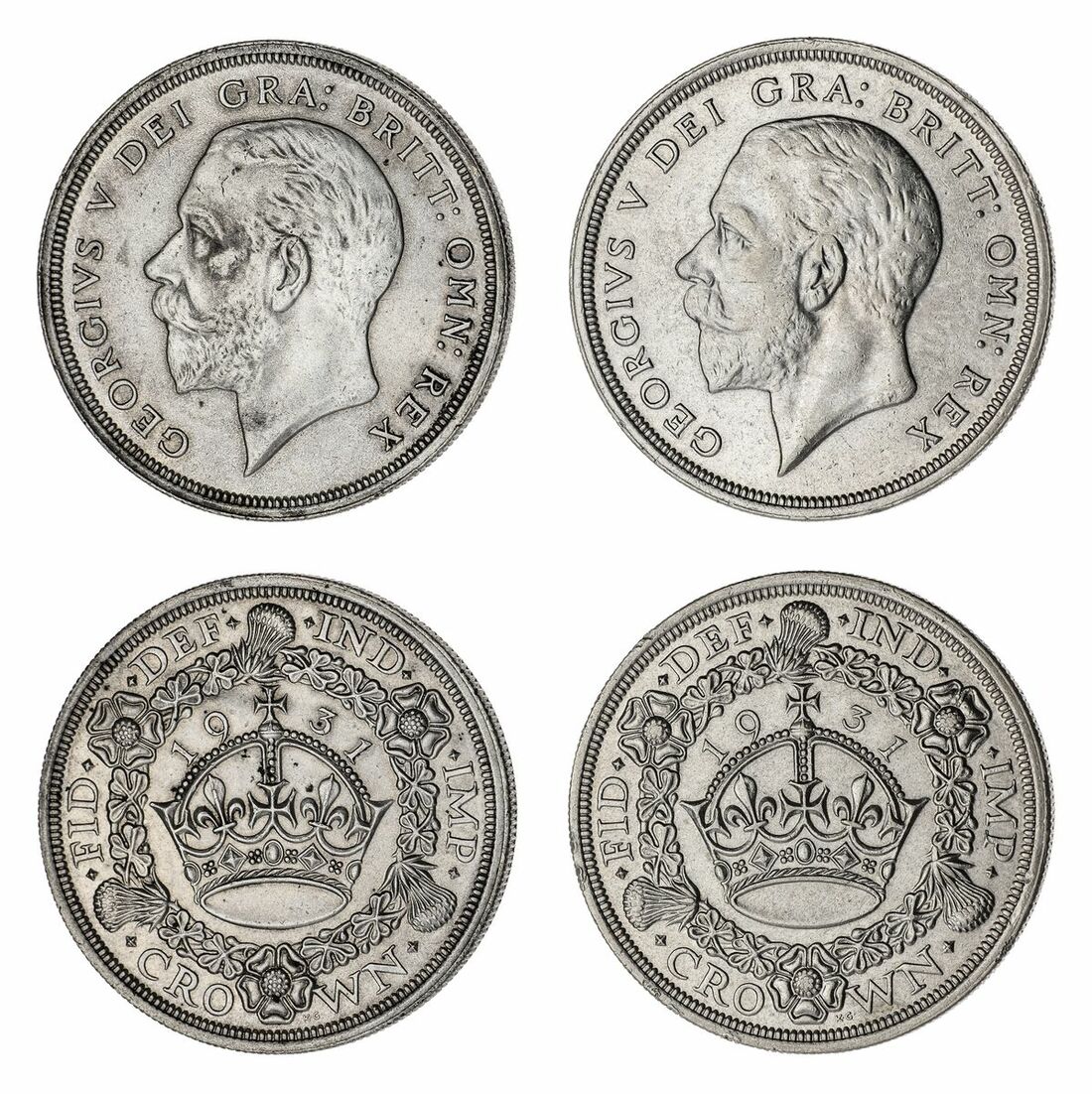 NGC UNC | George V (1910-1936), 'Wreath' Crown, 1931, bare head left, rev. crown within wreath, milled edge, 28.18g, 12h, cleaned and lightly contact marked, soft to the hair, yet the reverse with a faint lustre, a bolder very fine / extremely fine, one of only 4,056 struck, in NGC holder, graded UNC Details ~ Cleaned (Cert. #6767988-010); another, 1931, as before, milled edge, 28.21g, 12h (ESC 371; Bull 3639; S.4036), cleaned and soft to the portrait, very fine / extremely fine, one of only 4,056 struck, in NGC holder, graded AU DETAILS (Cert. # 6767988-009) (2)