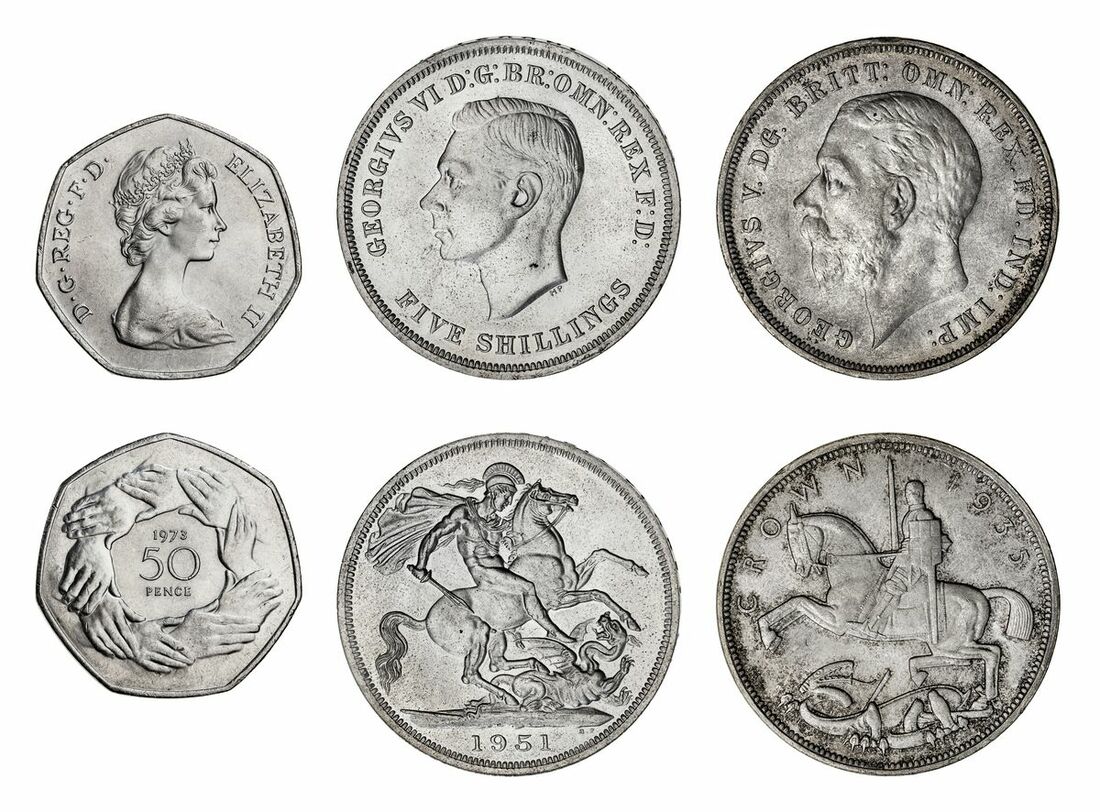 George V (1910-1936), 'Rocking Horse' Crown, 1935, bare head left, rev. St George and Dragon, modernistic style, incuse lettered edge, 12h, 28.24g (ESC 375; Bull 3651; Spink 4048), light scattering of bagmarks upon the portrait, nonetheless with a full minty fresh lustre, extremely fine; George VI (1936-1952), 'Festival of Britain' Crown, 1951, bare head left, rev. St George and dragon, incuse lettered edge, 28.27g, 12h (ESC 393C; Bull 4024; Spink 4111), light freckles of toning to otherwise proof-like fields, much as struck; Elizabeth II (1952-2022), 'European Economic Community' Fifty Pence, 1973, crowned and draped bust right, rev. circle of clasped hands, plain edge, 12h, 13.40g (Spink H2), couple of friction marks, otherwise with a full mint bloom, much as struck (3)