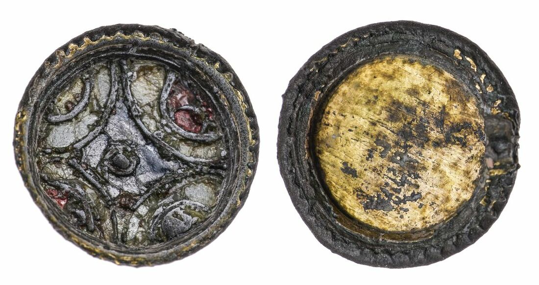 Anglo-Saxon (900-1100), gilt-copper and glass brooch, central diamond/cross motif with concave arms, a semi-circular form lies in each angle in a white colour, each with a smaller semi-circular cell of red or yellow at its outer edge, back plate gilded, stub of pin seat remains, 20mm diameter, 3.29g, [Spink XRF, FRONT: 72.26% Copper, 9.26% Antimony; 6.82% Lead; 6.82% Tin; 3.91% Iron; 1.09% Titanium; 0.84% Gold; 0.42% Manganese; 0.22% Silver; 0.21% Zinc; 0.204% Zirconium, BACK: 84% Copper; 9.22% Gold; 3.1% Tungsten; 1.14% Lead; 0.86% Tin; 0.779% Iron; 0.45% Germanium; 0.41% Titanium], (cf. BM 1870,0402.59; 1935,1210.1; cf. PAS LEIC-30B5F6; NLM-79996F), glass is cracked in areas with some missing from sections, red colour remains bright and the gilded back still bright, a pleasing little example of an early medieval artefact, largely complete, near very fine