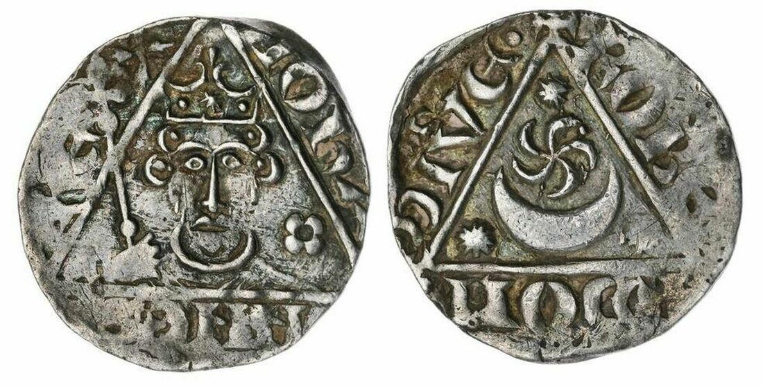 Anglo-Irish Issues, John, as Lord of Ireland (1199-1216), Third Coinage, Penny, c. 1208/9-1211/12, Dublin, Roberd, crowned bust facing, with sceptre, all in triangle, rev. sun, moon and three stars in triangle, 1.43g (Spink 6228), rubbed to the legends, otherwise the portrait pleasing, and handsomely toned, a bolder very fine