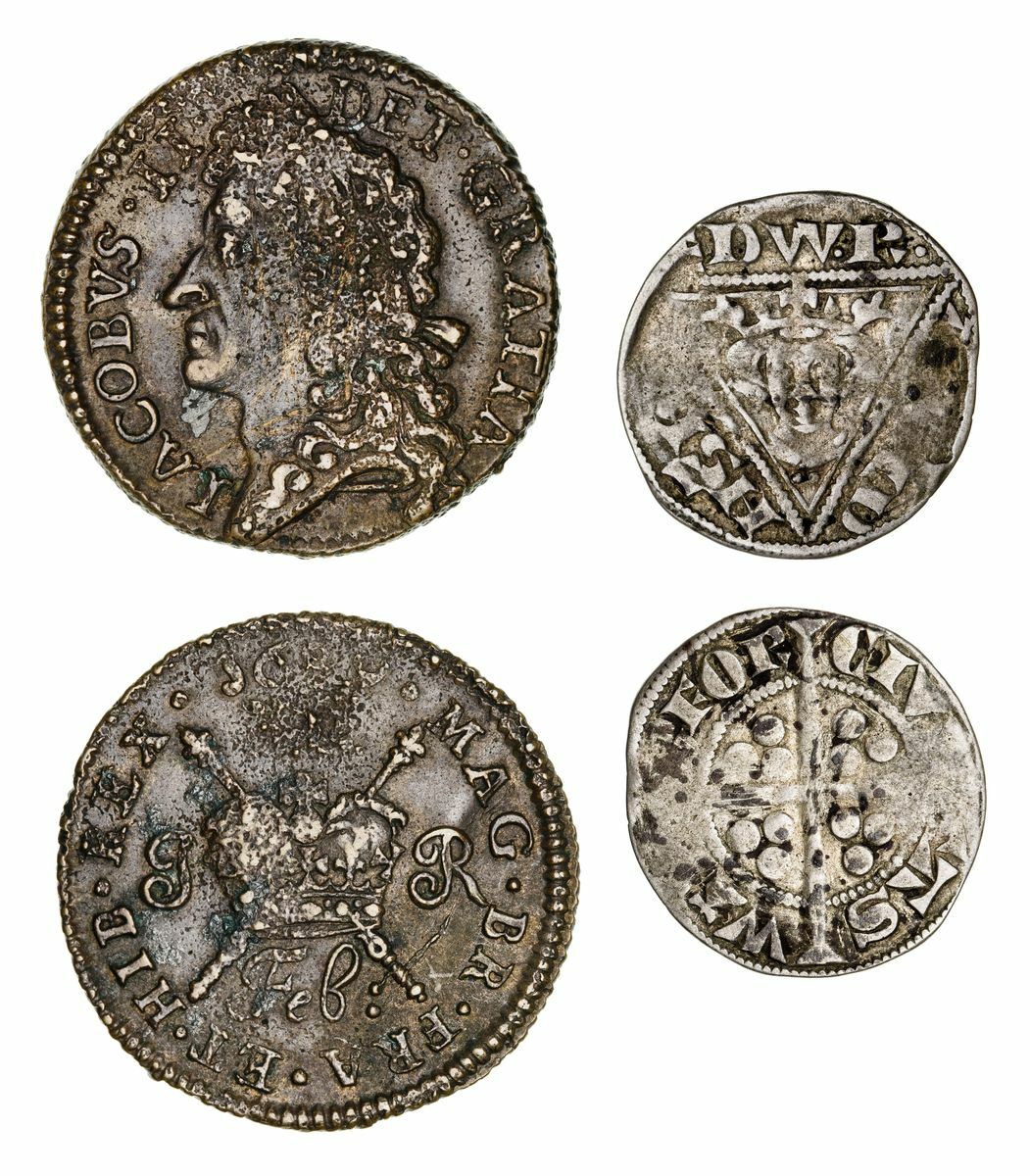 Ireland, Edward I (1272-1307), Second Phase, Second Coinage, 1279-1302, Penny, Waterford, crowned facing bust, pellets on bust, rev. CIVITAS WA[TER]FOR, long cross and trio of pellets in angles, 12h, 1.30g (Spink 6249), soft in parts and dark deposits to the reverse, about very fine; Irish Civil War, James II (1685-1691), 'Gunmoney', Large Shilling, February 1689, laureate and draped bust left, rev. crown and sceptres in saltire, dividing J-R, Feb : below, obliquely milled edge, 12h, 6.04g (Spink 6581H), pitted fields and with spots of verdigris, better to parts of the portrait, very fine (2)