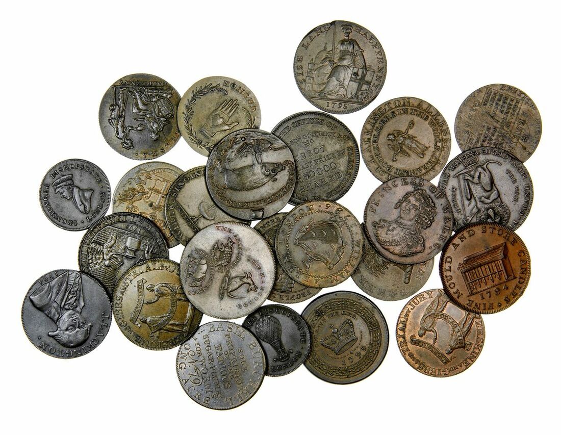 MIDDLESEX, London, Francis Shakleton, Halfpenny, 1794, PAYABLE IN DUBLIN OR LONDON on edge, 12h, 9.35g (D&H 477a), with handsome light brown surfaces, lustrous, extremely fine; William Allen, Halfpenny, 1795, PAYABLE IN CHANDOS STREET COVENT GARDEN on edge, 6h, 9.05g (D&H 246), lustrous, hints of red, extremely fine; Chelsea, Halfpenny, 1795, obliquely milled edge, 6h, 9.56g (D&H 277), rub to the higher points, yet lustrous, good very fine; Blackfriar's, Halfpenny, undated, plain edge, 12h, 10.21g (D&H 257a), flat to the higher points, yet red to the recesses, good very fine/extremely fine; Thomas Hall, Halfpenny, 1795, plain edge, 6h, 8.72g (D&H 313), blue and red tone, lustrous, extremely fine; Philip Astley, Lyceum, Halfpenny, undated, PAYABLE AT LONDON BATH OR MANCHESTER on edge, 12h, 8.94g (D&H 362b), very fine; Basil Burchell, Halfpenny, undated, THIS IS NOT A COIN BUT A MEDAL on edge, 6h, 9.19g (D&H 274), flashes of mint red and lustrous, extremely fine and scarce; Political and Social Series, Erskine and Gibb, Halfpenny, 1794, obliquely milled edge, 12h, 9.62g (D&H 1012), largely mint red, lustrous, extremely fine; another, obliquely milled edge, 12h, 9.62g (D&H 1012), hints of red, lustrous, extremely fine; Dennis, Halfpenny, 1795, PAYABLE AT I DENNIS LONDON on edge, 6h, 8.97g (D&H 297), light contact marking, yet with hints of red, good very fine; William Forster, Halfpenny, 1795, plain edge, 6h, 14.68g (D&H 302), very fine; Eaton's Halfpenny, 1795, obliquely milled edge, 7h, 8.90g (D&H 301), some rub, very fine; Holborn and Clerkenwell, John Skidmore, Halfpenny, 1795, obliquely milled edge, 6h, 9.74g (D&H 480), lustrous, extremely fine; Davidson's Halfpenny, 1795, plain edge, 6h, 10.59g (D&H 295a), flan crack and die flaw to the reverse, otherwise with flashes of red, extremely fine; Cornhill, Richardson Goodluck & Co, Halfpenny, 1795, plain edge, 6h, 11.23g (D&H 467), good very fine; Spence's Halfpenny, undated, plain edge, 6h, 9.11g (D&H 842b), dark brown surfaces, extremely fine; Gilbert Pidcock, Halfpenny, 1801, plain edge, 6h, 9.43g (D&H 453), light contact marking, otherwise good very fine; Isaac Earlysman, Farthing, c.1823, obliquely milled edge, 6h, 5.74g (Malpas 27), very fine; another, different dies, obliquely milled edge, 12h, 5.46g (Malpas 29), very fine; National Series, Princess of Wales, Halfpenny, 1795, obliquely milled edge, 6h, 8.56g (D&H 981d), lightly cleaned, yet about extremely fine; James Lackington & James Allen, Halfpenny, 1794, PAYABLE AT THE TEMPLE OF THE MUSES on edge, 6h, 9.55g (D&H 353), soft to the higher points, good very fine; another, as before, obliquely milled edge, 6h, 9.81g (D&H 354), lightly marked, very fine; Political and Social Series, John Horne Tooke, Halfpenny, 1794, plain edge, 6h, 8.85g (D&H 1044b), die flaw to reverse, otherwise very fine; Thomas Spence, Odd Fellows Halfpenny, undated, plain edge, 12h, 6.54g (D&H 804c), die flaw to the obverse, yet hints of mint red, bolder very fine (24)
