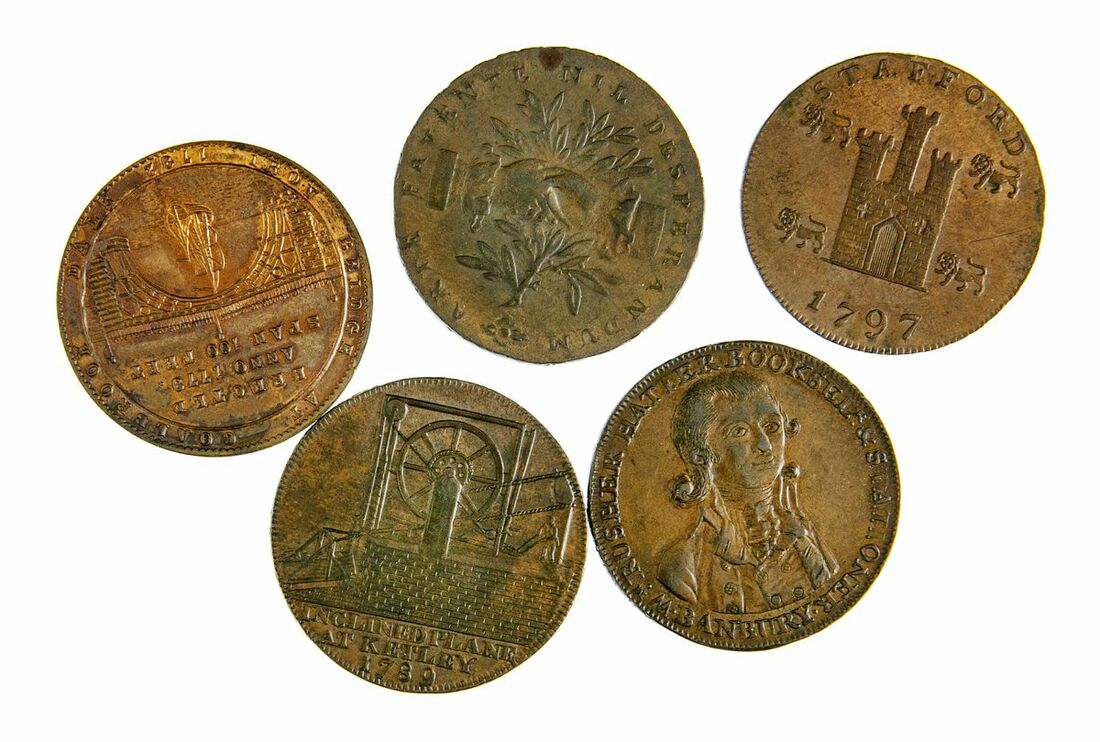OXFORDSHIRE, Banbury, Halfpenny, bust of William Rusher, rev. arms of Banbury, PAYABLE AT BANBURY OXFORD READING on edge, 6h, 8.99g (D&H 1); SHROPSHIRE, Coalbrook Dale, Halfpenny, 1792, ship sailing under bridge, rev. man working a machine, INCLINED PLANE AT KETLEY below, PAYABLE T COALBROOK-DALE AND KETLEY on edge, 6h, 14.41g (D&H 10); as before, plain edge, 12h, 14.72g (D&H 15); STAFFORDSHIRE, Leek, Halfpenny, 1793, caduceus, bae of good behind, rev. two hands united, olive branch behind, PAYABLE AT LEEK . STAFFORDSHIRE, 11h, 9.97g (D&H 15); Stafford, Halfpenny, undated, 1797, arms of the borough, rev. WH cypher, PAYABLE BY HORTON AND COMPANY ++++ on edge, 6h, 10.02g (D&H 20), the third and last with handsome red toning, lustrous, extremely fine, the rest all good very fine (5)