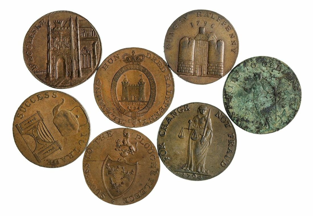 SUFFOLK, Beccles, FSU (unknown issuer) Halfpenny, 1795, south porch of the church, rev. bridge over the Waveney, PAYABLE AT BECCLES SUFOLK / * / * / */ on edge, 6h, 11.18g (D&H 16); Blything, Loyal Suffolk Yeomanry Halfpenny, 1794, mounted yeoman, sword to L, rev. castle within crowned Garter, GOD SAVE THE KING AND CONSTITUTION . X X . on edge, 12h, 11.33g (D&H 19); Bungay, Halfpenny, 1794, Bigods castle, rev. Justice standing, plain edge, 6h, 10.15g (D&H 22); Bungay Halfpenny, 1796, Bigods castle, rev. Justice standing, PAYABLE BY SAMUAL PRENTICE . X . X . on edge, 6h, 10.79g (D&H 24); Bury, undated, shield of arms of Bury, rev. PAYABLE AT JAMS. GOERS IRONMONGER BURY, plain edge, 6h, 9.35g (D&H 27); Bury, Halfpenny, undated, arms and crest of Bury, rev. kettle and stove, obliquely milled edge, 6h, 10.55g (D&H 28); NORFOLK, Norwich, Halfpenny, (1792), bottle, rev. Hope standing, RICHARD DINMORE & SON NORWICH. X X X X . on edge, 12h, 9.81g (D&H 23), the last weather worn and green, bolder fine, the rest all with pleasing brown and red surfaces, many with a handsome glass-like lustre in the fields, very fine to extremely fine (7)