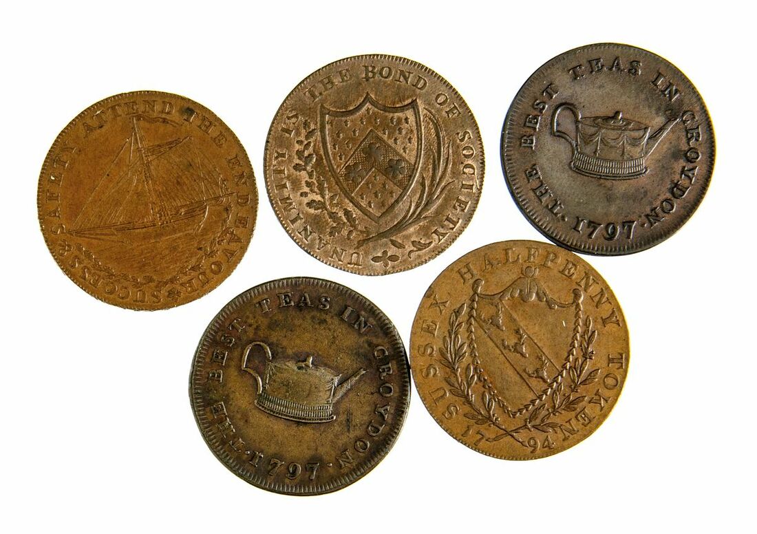 SUSSEX, Hastings, Halfpenny, 1794, ship, rev. shield of arms, PAYABLE BY JAMS TEBAYS HASTINGS + . + . + . + . + on edge, 6h, 9.56g (D&H 25); Lamberhurst, Halfpenny, 1794, hop garden, rev. shield of arms, PAYABLE BY T. FOSTER LAMBERHURST +++++ on edge, 6h, 9.90g (D&H 35[Kent]); Northiam, Halfpenny, 1794, shield of arms, rev. EG cypher, squirrel above, PAYABLE AT G. GILBERTS NORTHIAM X . X . X . X . X . on edge, 6h, 9.82g (D&H 35); SURREY, Croydon, Halfpenny, 1797, DG Cypher, rev. teapot, plain edge, 11h, 6.96g (D&H 7); another, with corrected spelling, plain edge, 12h, 7.33g (D&H 8), the last two very fine, the others all with pleasing light brown surfaces, the Northian with flashes of red, all lustrous, extremely fine to uncirculated (5)