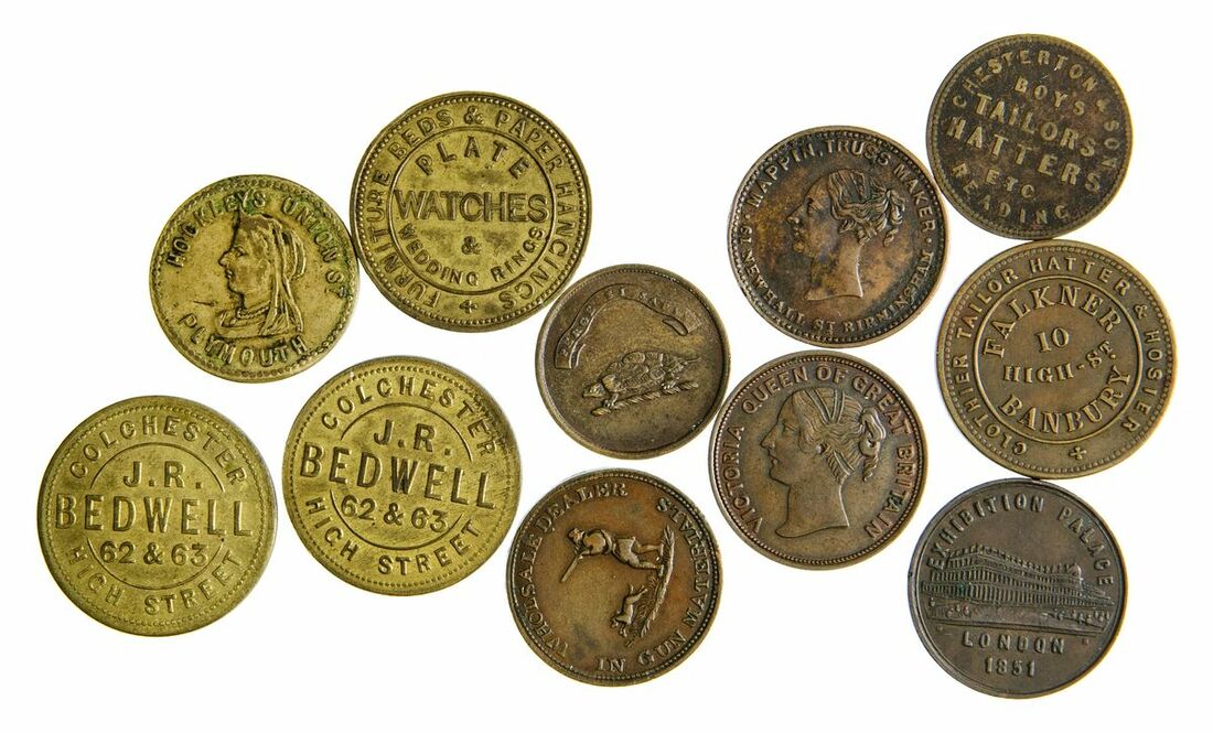 BEDFORDSHIRE, Leighton Buzzard, W. Manley, Tea Dealer, Farthing, 1851 (W 1990); BUCKINGHAMSHIRE, High Wycombe, W. Skull, Grocer and Tea Dealer, Farthing, c. 1853 (W 1801); BERKSHIRE, Reading, Chesterton & Sons, Tailors, Farthing, undated (W 4423); MIDDLESEX, Uxbridge, Farthing, undated (W 4955); ESSEX, Colchester, John Bedwell, Furniture Dealer, Farthing, undated (W 1440); another, (W 1430); another, (W 1450); OXFORDSHIRE, Banbury, Falkner, Tailor, Farthing, undated (W 80b); William Cazey, Wine and Spirit Merchant, Farthing, undated (W 90); Blewbury, S. Huggins, Gun Maker, Farthing, undated (W 1072); DEVON, Plymouth, Hockley's, Clothier, Farthing, undated (W 4285), fine to good very fine (11)