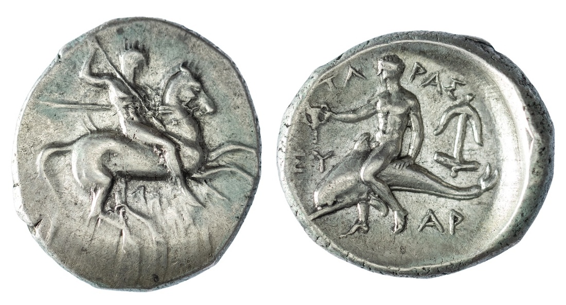 Calabria, Taras, AR Nomos, Anthrop..., Eu... and Ap..., magistrates, struck c. 302-281 BC, nude warrior riding right on horseback, lancing with a spear in his right hand, holding two more spears and shield in his left, ANTH/ROS below, rev. TARAS, Taras riding dolphin left, holding kantharos, EY to left field, anchor inverted to right field, AP below, 7.79g (HN Italy 966; Vlasto 691; Brunetti XXV, 11 (291 BC)) obverse struck from worn dies, detailed reverse, very fine to good very fine