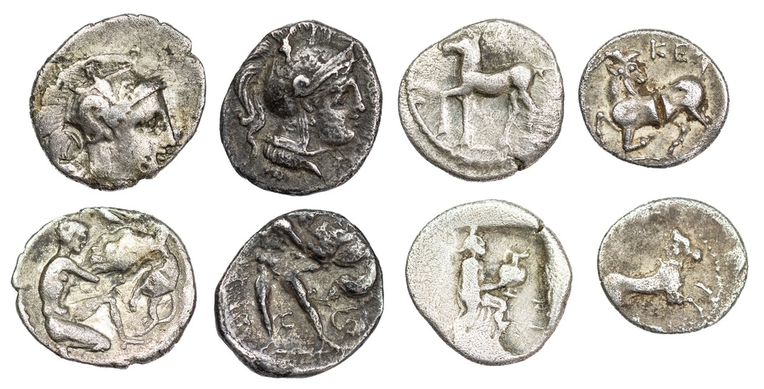 A Selection of Greek Fractionals (4): i) Lucania, Herakleia, AR Diobol, head of Athena right, wearing crested Attic helmet ornamented with hippocamp, rev. Herakles wrestling the Nemean lion, 0.88g (HN Italy, 1379; van Keuren 53), somewhat worn, about very fine; ii) Calabria, Tarentum, AR Diobol, struck circa 325-280, head of Athena right, as before but no hippocamp, rev. as before, G between the legs of Herakles, 1.14g (Vlasto –. HN Italy 986), toned, very fine, rare with this reverse; iii) Thessaly, Larissa, AR Obol, struck c. 460-400 BC, horse trotting left, rev. the nymph Larissa standing right, balancing hydria on knee, to her left, a water fountain in the form of a lion's head spouting water, all within incuse square, 0.92g (BCD Thessaly II 361.3; HGC 4, 483), toned with slight die-wear, still near very fine; iv) Cilicia, Kelendris, AR Obol, struck c. 410-375 BC, forepart of Pegasos right, rev. goat kneeling right, head left, 0.75g (Göktürk 7; SNG BN 81–4; SNG Levante 27), lightly toned, obverse rather ganular, reverse very fine despite test cut; (4).