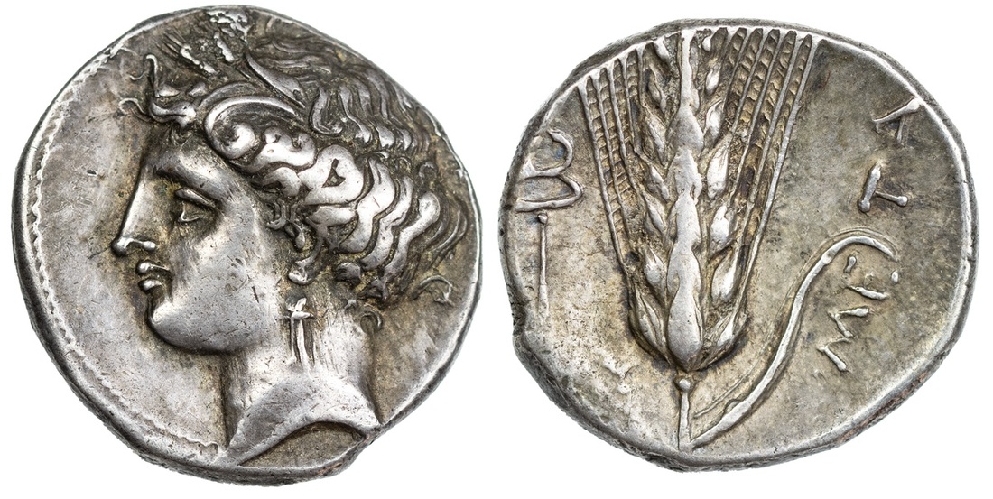 Lucania, Metapontum, AR Stater, struck c. 300-280 BC, wreathed head of Demeter left, rev. META, ear of barley with leaf to right, caduceus above [L]Y to left field, 7.93g (Johnston, Metapontum A1.4, HN Italy 1556), some wear to reverse fields, otherwise very fine