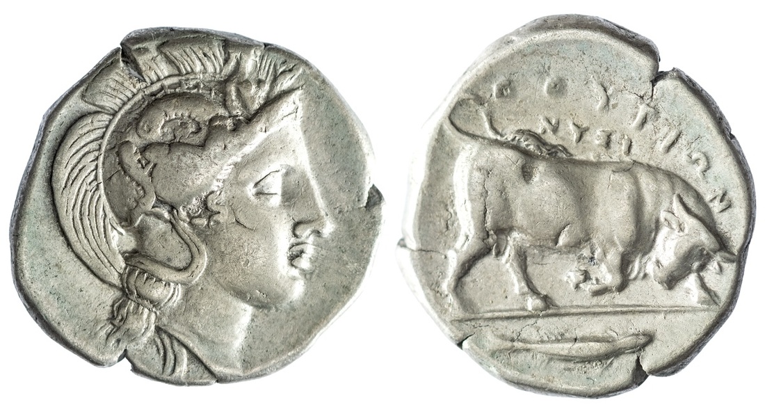 Lucania, Thurium, AR Nomos, struck c. 410-330 BC, head of Athena right, wearing crested Attic helmet decorated with Scylla holding a trident in her right hand, rev. THOURION, bull butting right, NYSI above, fish in exergue, 7.84g (Antike Kunst (1967), 455 (these dies); HN Italy 1790; SNG ANS 1055 (dies); SNG Delepierre 394), splits to edge, nevertheless very fine and rare