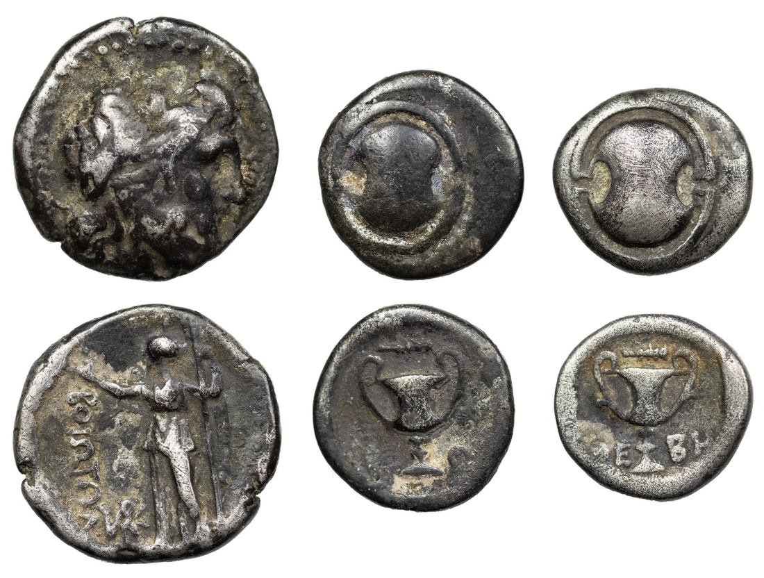 Boeotia, Trio of Small Silver (3): i) Thebes, Hemidrachm, struck c. 426-395 BC, shield, rev. amphora, club above, THEBH below, all within incuse square, 2.45g (SNG Copenhagen 290), about fine; ii) another, as before, but B OI below, 2.45g (cf. BCD Boiotia 32; SNG Copenhagen 170-171), dark tone, good to fine; iii) Federal Coinage, AR Drachm, laureate head of Poseidon right, rev. BOIOTON, Nike standing left, resting on trident and holding wreath, VAPK monogram to lower left, 4.90g (BCD 122; McClean 5619), good to fine; (3).