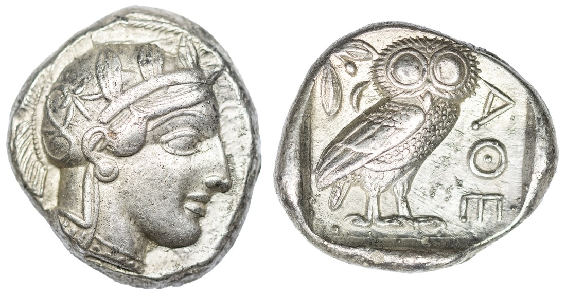 Attica, Athens, AR Tetradrachm, struck c. 454-404 BC, head of Athena right, wearing crested Athenian helmet ornamented with olives and palmette, rev. ATHE, owl standing right, head facing, olive sprig above crescent to upper left, all within a shallow incuse square, 17.20g (Kroll 8; HGC 4, 1597), some roughness to obverse surfaces, nevertheless detailed, lightly toned and good very fine or better