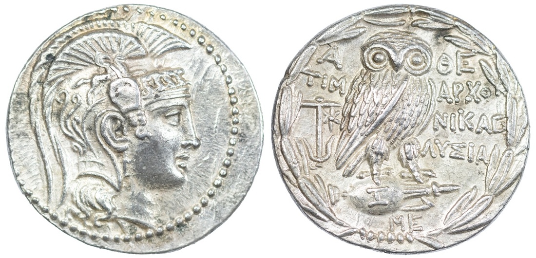 Attica, Athens, AR Tetradrachm, 'New Style', Timarchos, Nikag(oras), and Lysia-, magistrates. Struck 134/3 BC, head of Athena Parthenos right, wearing crested Attic helmet, rev. A/THE, TIM/ARCHO, NIKAGO, LYSIA, Owl standing on amphora right, facing, anchor with star to left field, I/Z on amphora, ME below, all within wreathed border, 16.84g (Thompson 365a (same dies); HGC 4, 1602; Svoronos, Monnaies pl. 50, 6 (same dies)), slight die-flaws to obverse, nevertheless a powerful example with a stylised portrait and detailed reverse, lightly toned, about extremely fine