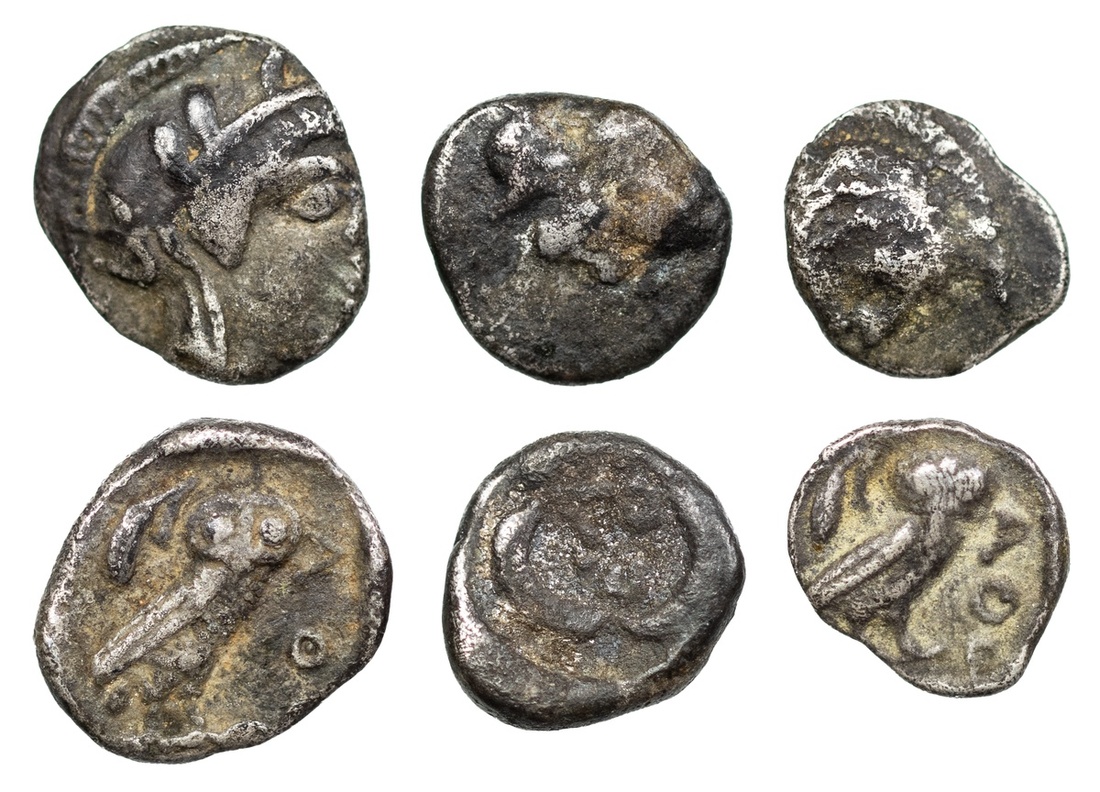 Attica, Athens, a Trio of Silver Fractions (3): i) Obol, struck c. 454-404 BC, head of Athena right, rev. owl standing right, head facing, olive sprig to upper left, all within incuse square, 0.66g (HGC 4, 1665; Kroll 13), toned, slightly granular surface, about very fine; ii) Hemiobol, as before, 0.35g (HGC 4, 1681; Kroll 14), obverse struck off-flan, otherwise near very fine; iii) Tritetartemorion (3/4 Obol), as before, rev. ATHE surrounded by three crescents, 0.49g (BMC 187; HGC 4, 1668; Kroll 21), fine; (3)