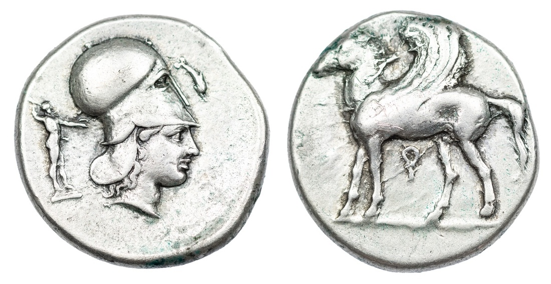 Corinthia, Corinth, AR Stater, c. 415-387 BC, Pegasos with curled wings standing left, koppa below, rev. head of Athena right, wearing Corinthian helmet, a statuette of Zeus hurling thunderbolt right behind, dolphin before, 8.56g (Ravel 692; Pegasi 174), softened, good fine and very rare