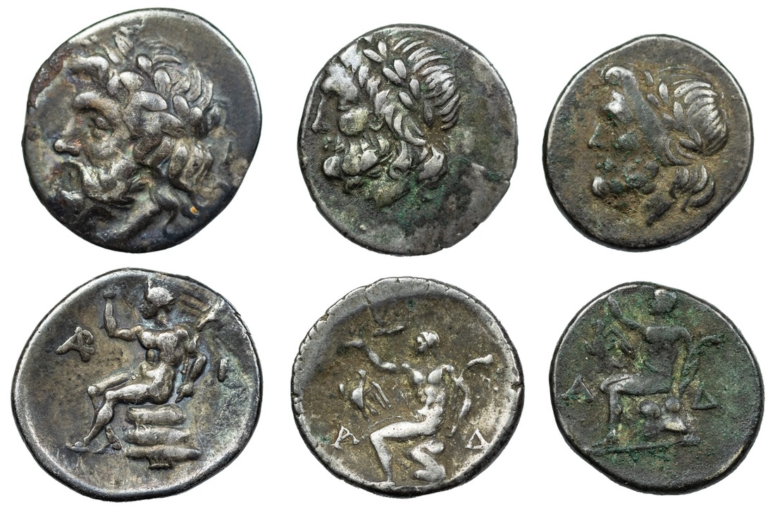 Arkadian League, Megalopolis, Trio of Triobols, struck c. 320-275 BC (3): i) laureate head of Zeus left, I behind, rev. Pan, holding lagobolon and raising hand, seated left on rock, APK monogram to left field, I behind, 2.76g (Dengate, Period I, Issue 2, 3; BCD Peloponnesos 1523), toned, very fine; ii) another, as before, but rev. eagle to left, monograms to fields, 2.46g (HGC 5, 932), good fine; iii) another, as before, rev. A-D across fields, 2.46g, fine (3).