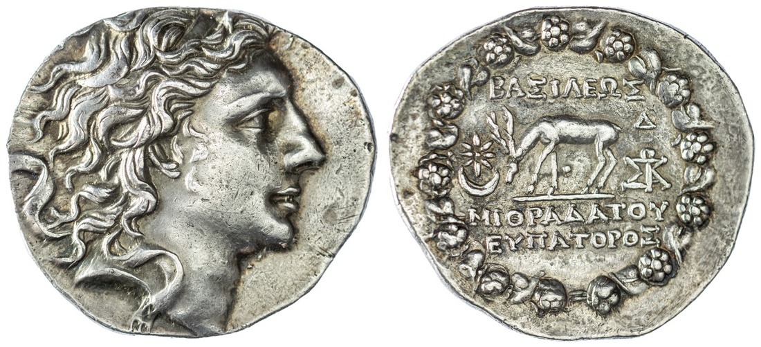 Kingdom of Pontus, Mithradates VI Eupator (120-63 BC), AR Tetradrachm, Pergamum, dated PE 4=85/4 BC, diademed head right, rev. BASILEOS MITHRADATOY EUPATOROS, stag grazing left, star above crescent to left, delta above monogram to right, all within ivy wreath, 16.45g (de Callataÿ p.23, pl. XIII; DCA 690; HGC 7, 341; Gulbenkian 944; Pozzi 209), struck upon a broad flan, toned, a lovely portrait with a few contact-marks, but otherwise good very fine to extremely fine