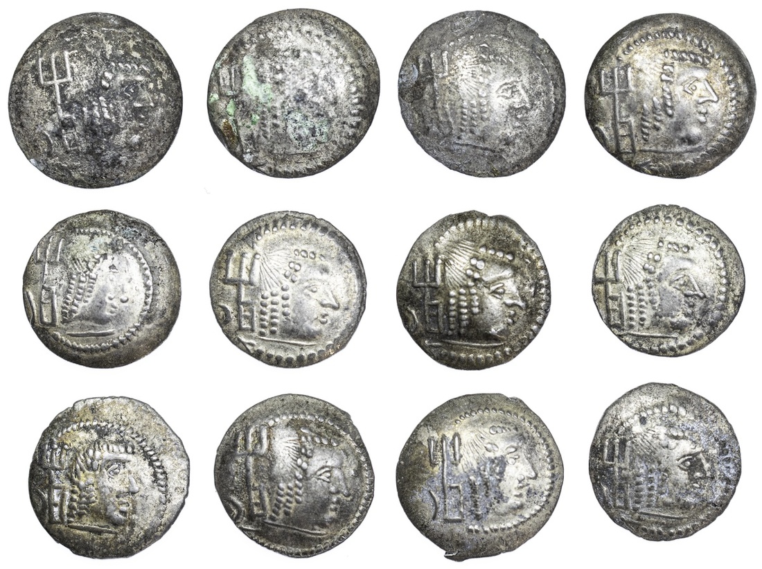 (x) Felix Arabia, Himyarites, temp. Amdan Bayyin, AR Quinarii, Raidan, struck c. AD 80-100, male head right, trident and monogram behind, surrounded by torc, rev. small male head right surrounded by Sabaean inscription and monogram, (SNG ANS 1595ff.), ranging from good to very fine; (12)