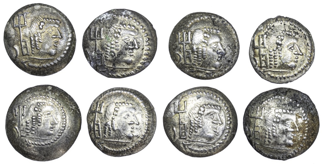 (x) Felix Arabia, Himyarites, temp. Amdan Bayyin, AR Quinarii, Raidan, struck c. AD 80-100, male head right, trident and monogram behind, surrounded by torc, rev. small male head right surrounded by Sabaean inscription and monogram, (SNG ANS 1595ff.), ranging from good fine to extremely fine; (8)